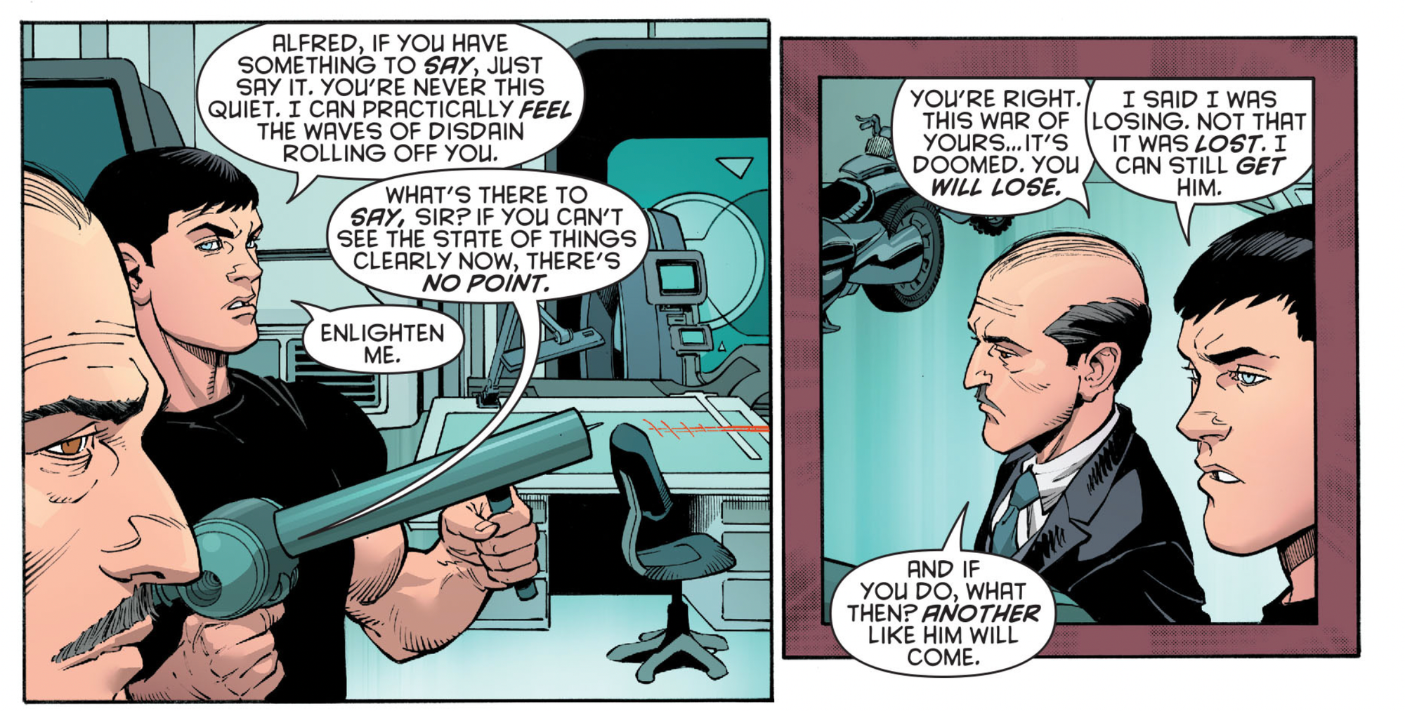 In 1987, writer Frank Miller and artist David Mazzucchelli created perhaps the definitive Batman origin story. While Bob Kane and Bill Finger imagined the iconic demise of Thomas and Martha Wayne, the four-issue arc Batman: Year One added nearly everything else, to the point that many other Batman stories continue to reference it today. Set before Gotham City is overrun with costumed criminals, it’s a less fanciful vision, instead featuring a more down-to-earth story about flawed men fighting a broken system. It’s about Batman’s first steps as a crimefighter, an icon still forming, and Reeves frames The Batman as a sort of follow-up to it. The lifts not just narrative elements but also character designs, particularly Catwoman’s look and Bruce Wayne disguising himself as a drifter. A shot of a villain sitting in a bright bar on a dark street conjures Mazzucchelli’s overt Hopper homage in the series’ fourth issue. Mazzucchelli works the ambiguity of Miller’s writing into his simple but rough line work, evoking the noirish overtones through a striking contrast between details and shadows, all housed in pleasingly minimalist page layouts. Meanwhile, Richmond Lewis’s more expressive use of color make the book’s melodramatic moments linger in the memory.