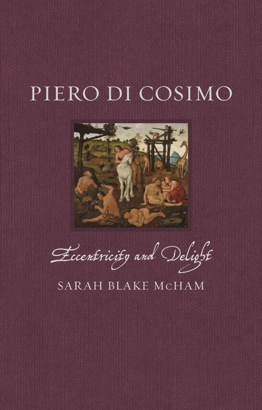 The tableau itself is crowded with figures indifferent to the god's presence. A man and woman cuddle with their infant, another man sleeps huddled in the fetal position, three craftsmen appear to raise a wooden house, a handsome and curious young man on horseback approaches Vulcan, and a giraffe perambulates in the distance past a hazy-blue horizon. The difficult-to-parse perspective only adds to the surrealism of the scene. As Rutgers University art historian Sarah Blake McHam explains in her well-argued, erudite, and elegant new book Piero di Cosimo: Eccentricity and Delight (2024), part of the British publisher Reaktion’s Renaissance Lives series, it is a “composition like no other in the Renaissance,” a work that’s “puzzling, even disconcerting.”