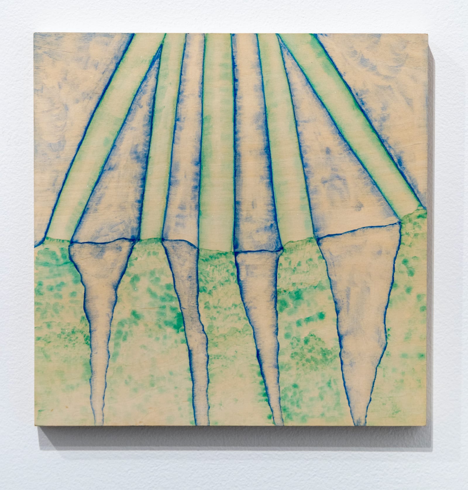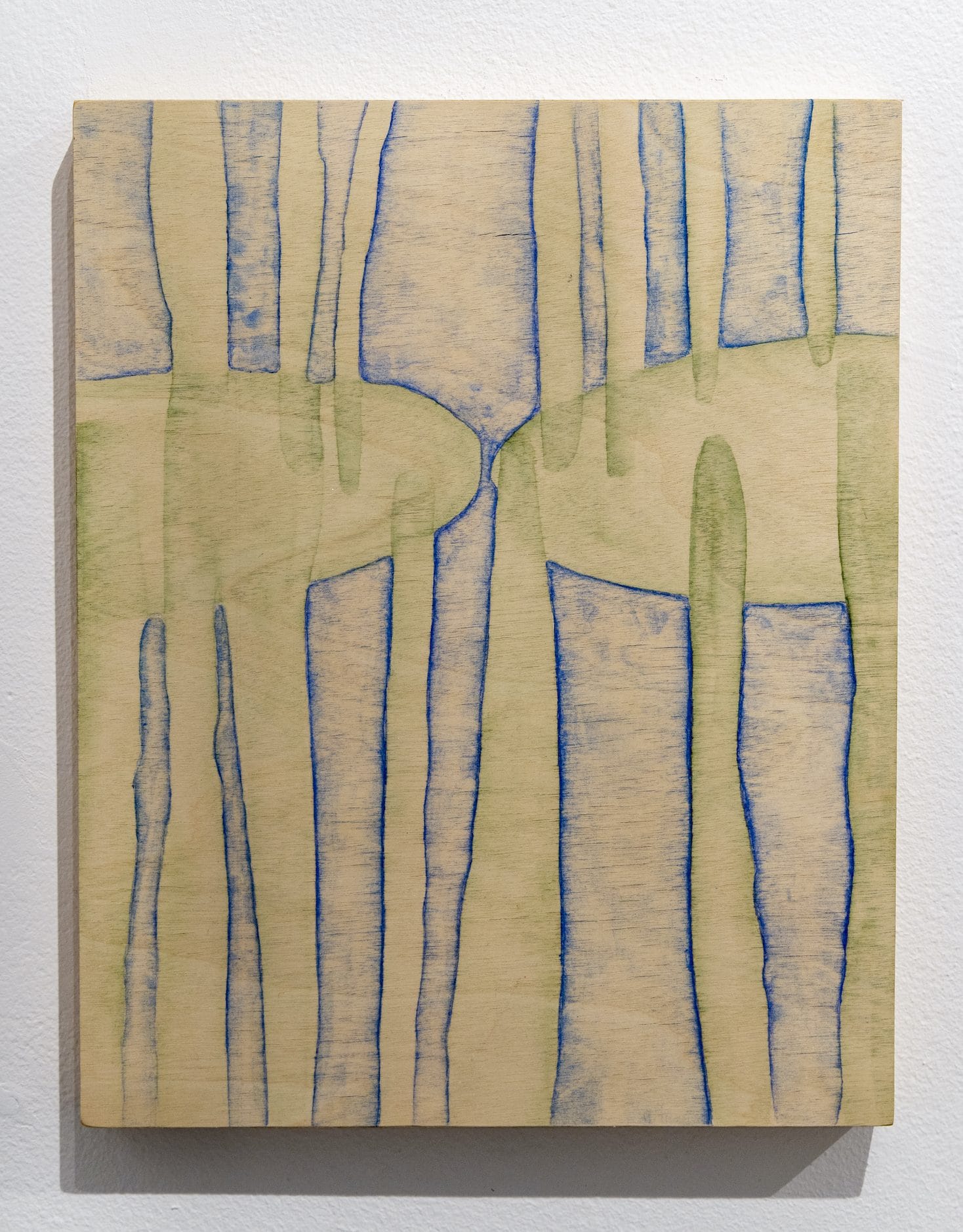 Mullican seems to have no set approach to her use of watercolor. Shapes can be outlined by the wood grain or be completely independent of it; or, using semi-transparent color, she incorporates it as another element in the composition. Additionally, the density of the colors change from solid to transparent and saturated to pale. In every work it appears that the artist interacted with the wood grain, rather than regarded the support as a blank surface.