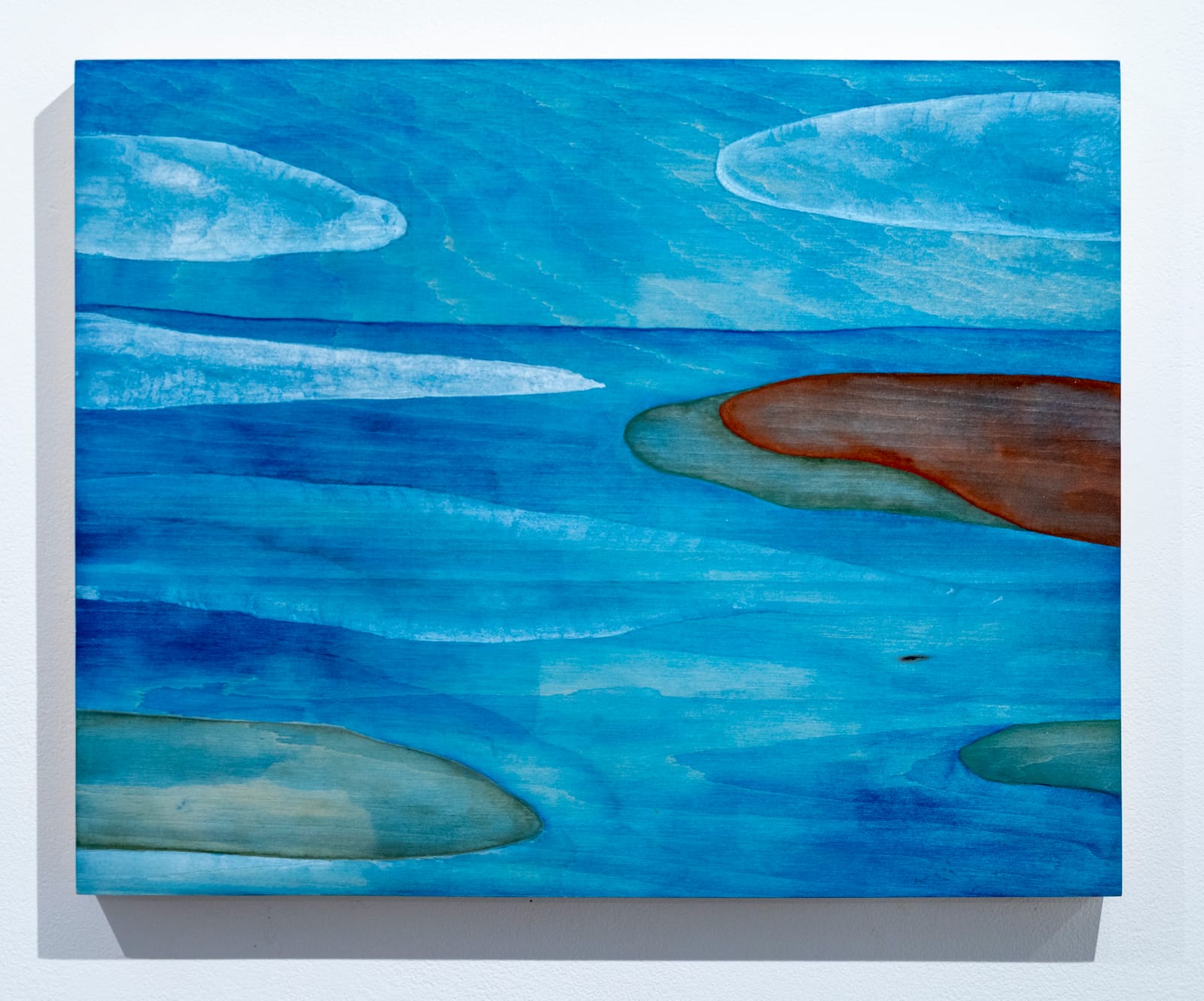 While Mullican’s work both extends from and revises landscape abstraction and the work of artists such as Arthur Dove and John Constable, I also feel that her interaction with the wood supports and her commitment to watercolor sets her in a category all her own. Whereas the creators of landscape abstractions generally believed their paintings were impervious to time, Mullican makes artworks that are exposed and susceptible.