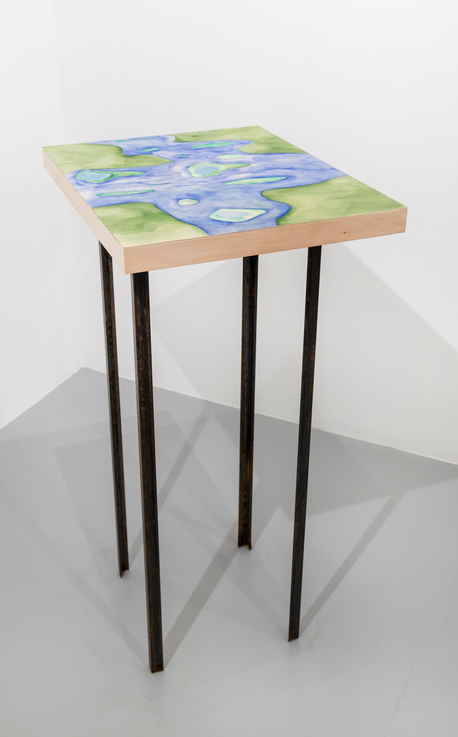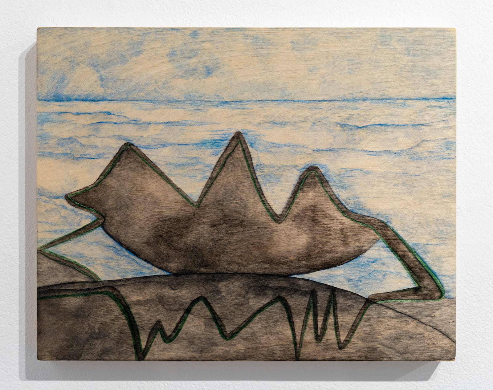 Mullican works with a simple but flexible vocabulary of tubular shapes, cloud-like stains, ellipses, and irregular shapes, and moves between abstraction and representation. At no point did I feel that her painting became predictable. In one of the exhibition’s larger works, using a palette of blues and greens, Mullican depicted an irregularly shaped, cross-like form, which extends beyond the wood panel’s four edges. In the interior of the rolling-edged cross, or blue water, the artist laid down green islands, whose shapes echo the visible lines of the wood grain pattern. Within some of the islands is a blue shape that transforms it into a flat, donut-like form. The relationship between the watercolor and wood grain is one of acknowledgement. In this way, their interaction is part of the meaning, as is a feeling that it could all fade, that everything is in some sense ephemeral in the face of time.