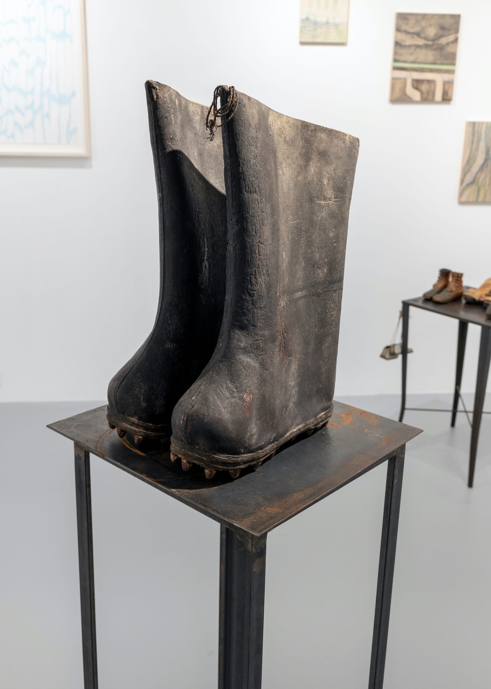 What connects the washes of pale grays, greens, and blues, the watercolors, drawings, and embroidery, and the shoes set on tables, like sculptures on pedestals, is a sense of impermanence and vulnerability. No longer used, the shoes evoke both an absent life and the enduring of materials that exist in time differently than us. Looking at an unusually shaped pair of swamp boots that I was told Mullican found in Chinatown, I was reminded of the last lines of Tomas Tranströmer’s poem “After Someone’s Death”: “The samurai looks insignificant/ beside his armor of black dragon scales” (translated from the Swedish by Robert Bly).