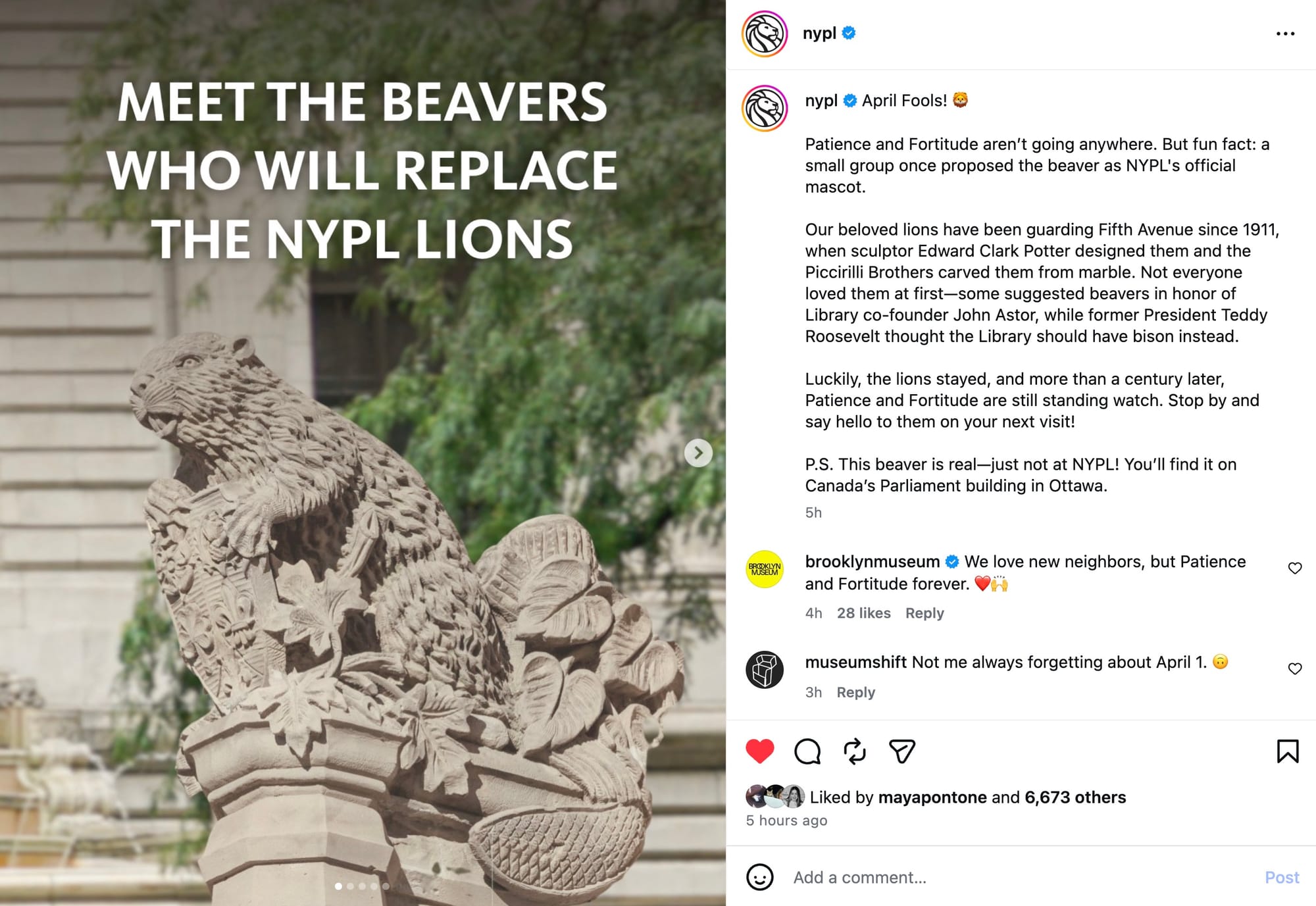 For April Fools’ Day, the New York Public Library is replacing its iconic lions with sculptures of beavers that look like me eating from a box of Cheez-Its.