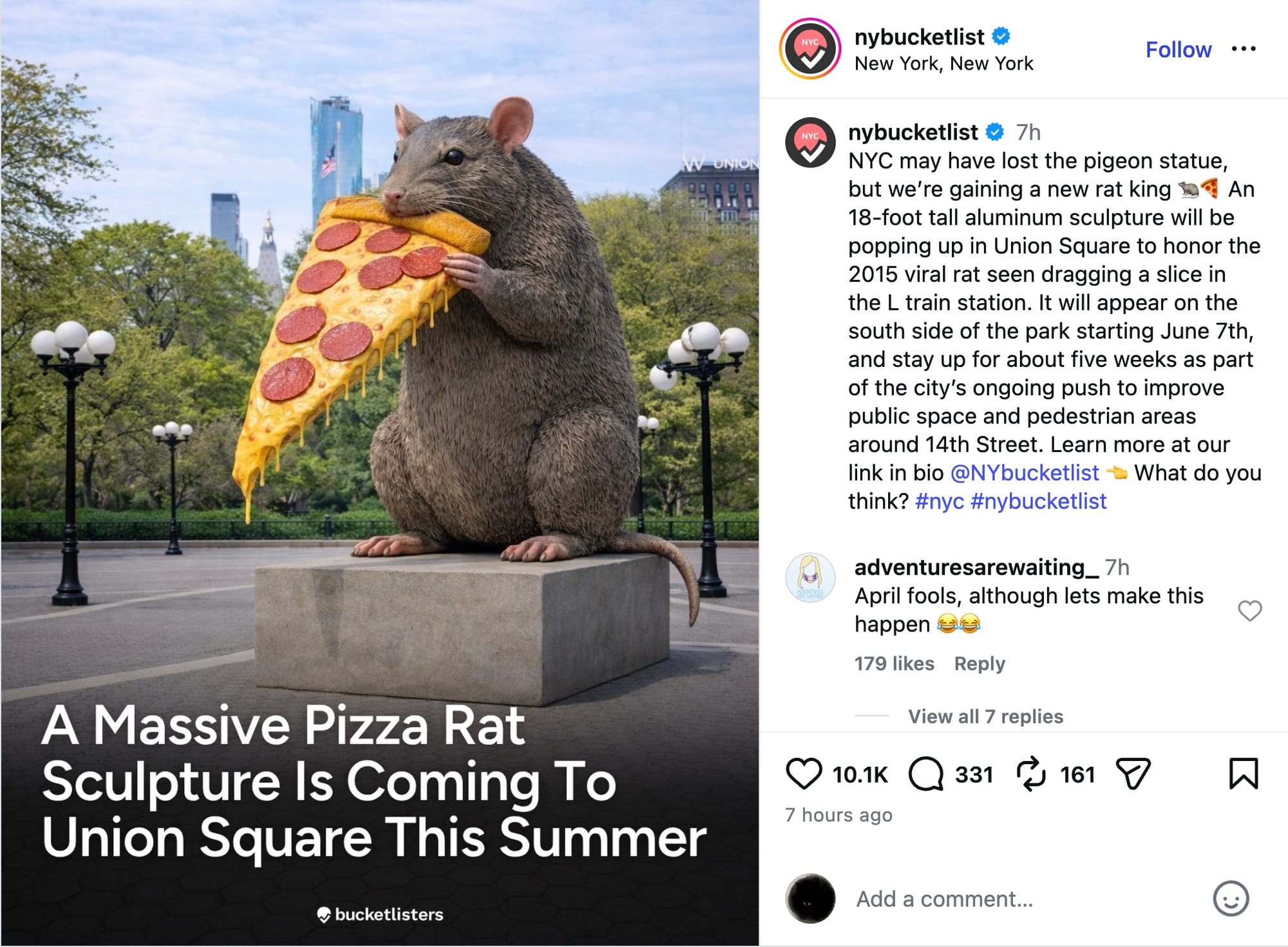 Pizza Rat has been an unofficial NYC mascot for over a decade now, but the beloved pigeon sculpture that temporarily graced the High Line may have actually paved the way for this to (hopefully) become a realized commission.