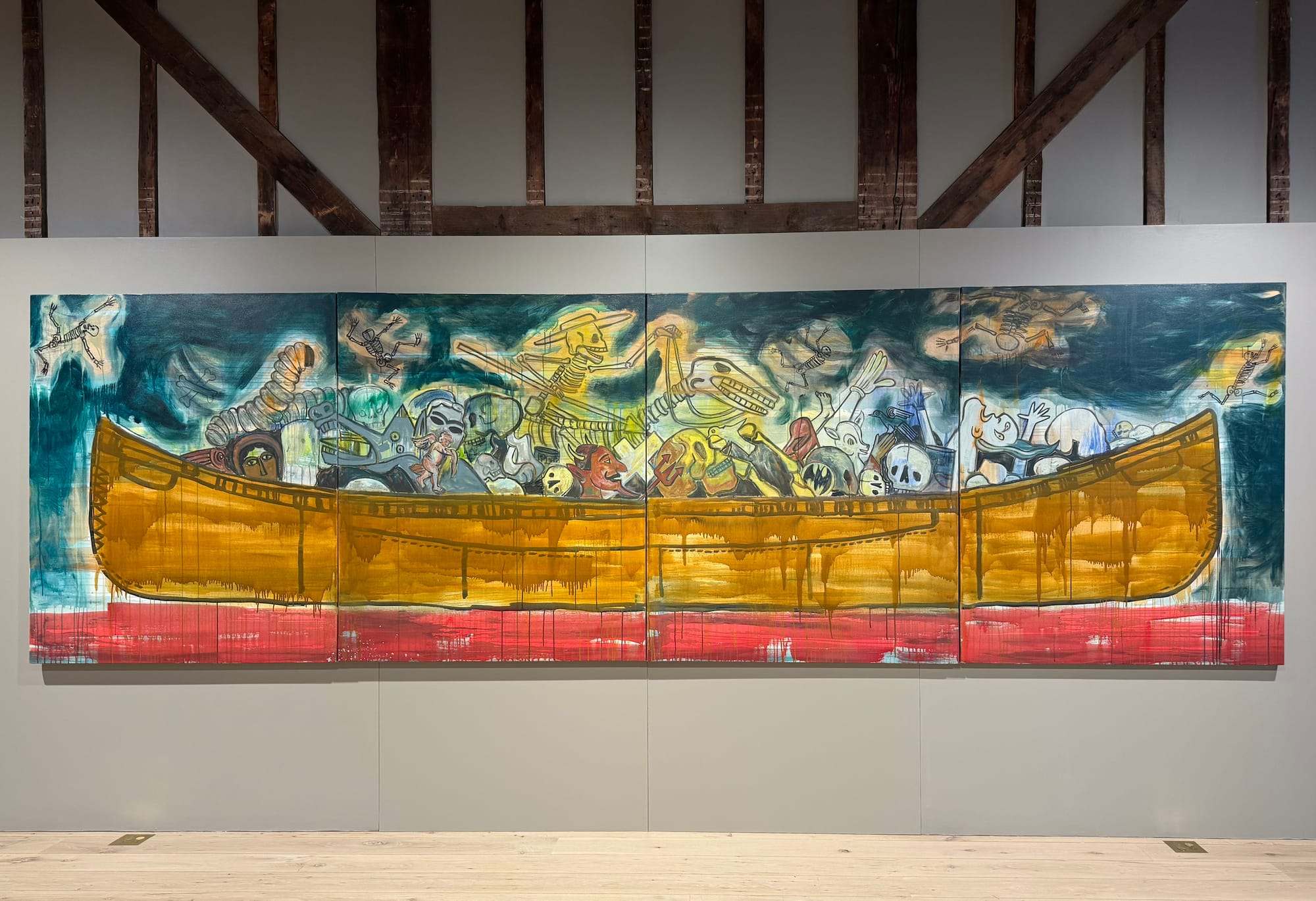 Three terms are defined on one gallery wall to carry with you throughout the exhibition: sovereignty, survivance, and Indigenous futurism. These phrases undergird the ethos of this vital show, which was a remarkable affirmation of the longevity of Indigenous cultures and artists working across mediums. Eternal Testament included artists from the Shinnecock and Montauk Nations, including Adrienne Terry, David Bunn Martine, Durrell Hunter, and Denise Silva-Dennis. Among the other highlights were depictions of James Luna’s 1991 performance “Take a Picture With a Real Indian,” Cara Romero’s “Last Indian Market” (2015), and a four-panel canvas by Jaune Quick-to-See Smith, “Trade Canoe: Don Quixote in Sumeria” (2005). —Jasmine Weber