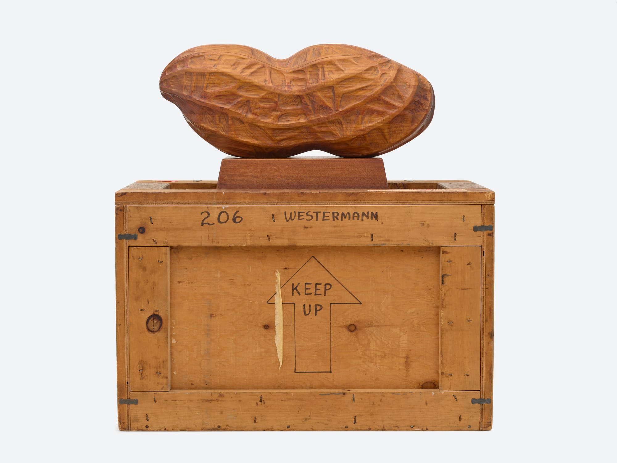 H. C. Westermann: Anchor Clanker celebrates a gift from the estate of Alan and Dorothy Press consisting of 17 sculptures the artist made between 1957 and ’81. An influential, one-person art movement, Westermann was a lone wolf who never fit into any genre or trend. At a time when fabrication had become the rage, particularly because of Donald Judd, Westermann built everything by hand, utilizing materials ranging from both rare and common types of wood to galvanized wire lath and sheet metal to AstroTurf, cast bronze, and copper. Haunted by memories of World War II kamikaze attacks, he created mechanical figures, a giant peanut, boxes, and planes crashing into what he called “death ships.” His beautifully crafted objects were both autobiographical and critical of the brainless materialism of the United States. For him, the country was a bleak comedy, at once disturbing, dangerous, absurd, and comic. —John Yau