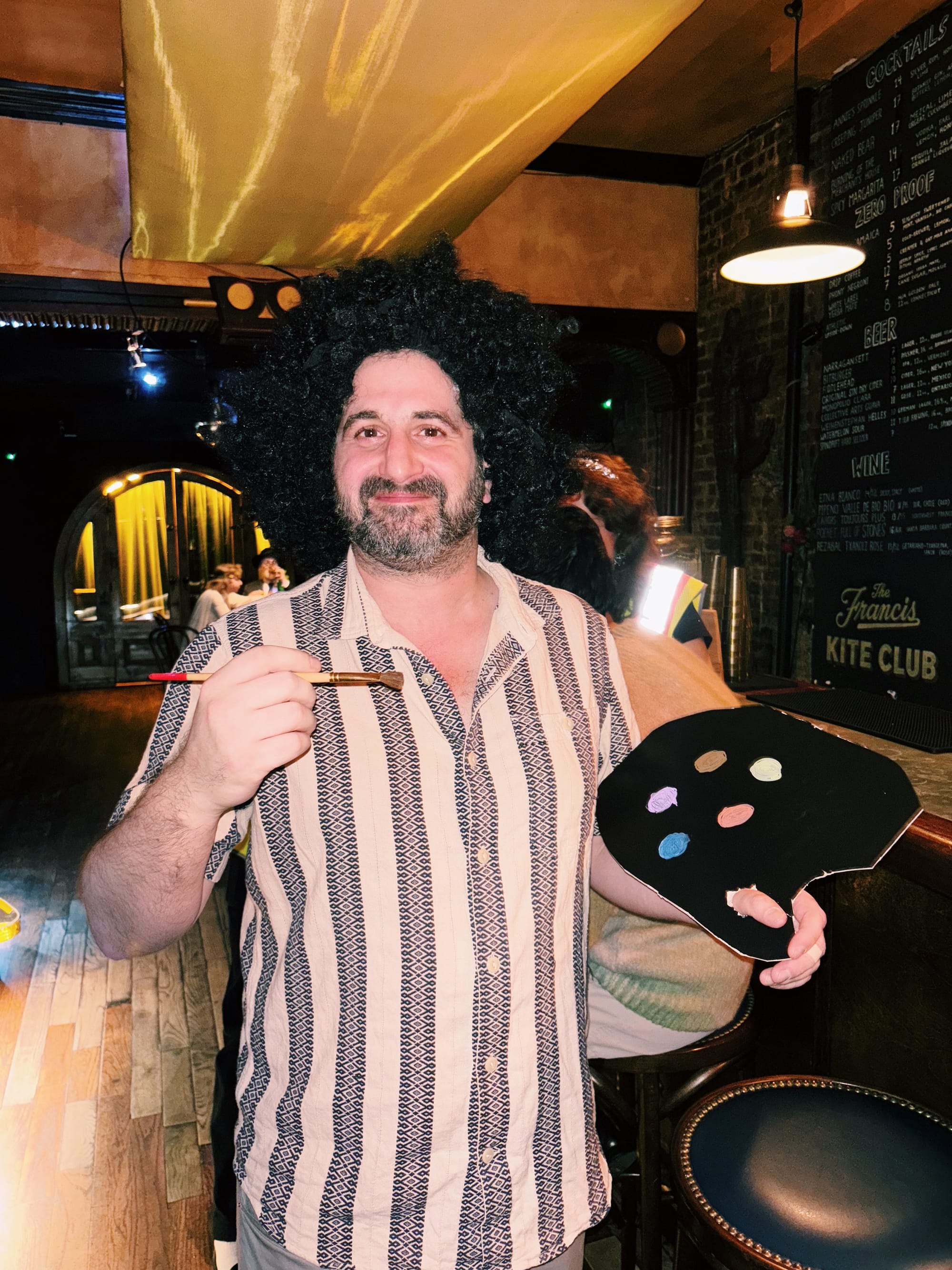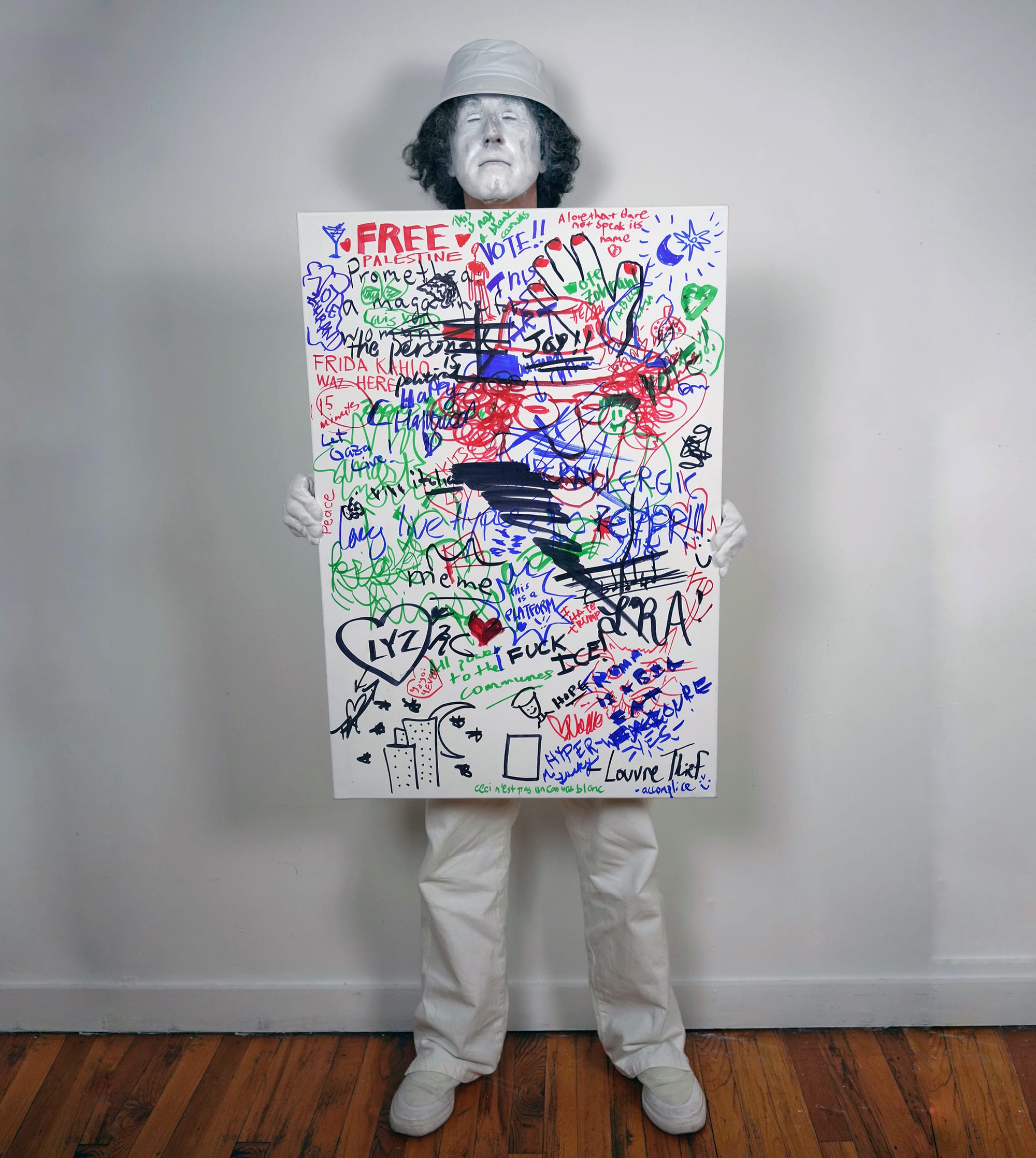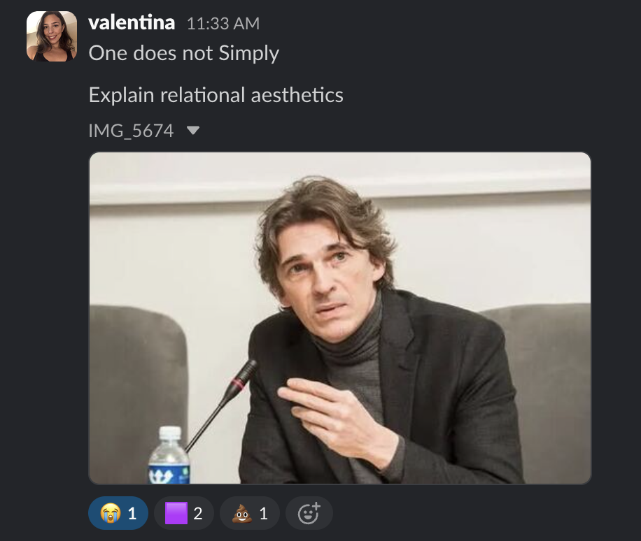 That's our very own writer and comic artist, Noah Fischer, whom I'm told snipped off some extra fabric from his daughter's Taro Boba costume (adorable) to transform into ... relational aesthetics? That's a deep cut (no pun intended), even for us. Well, most of us — it delighted News Editor Valentina Di Liscia, resident theory-head, who had this to say by way of "explanation":