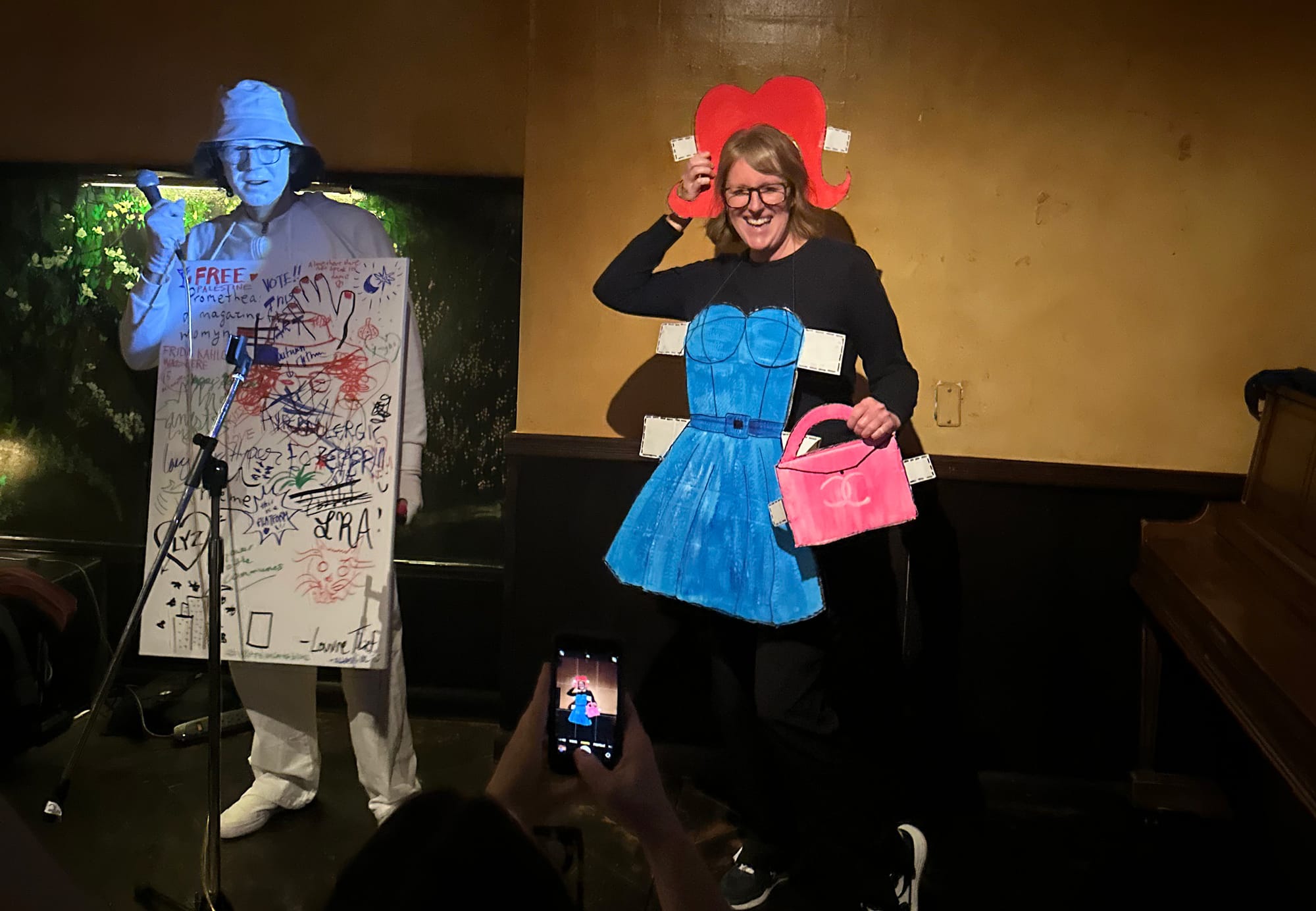 We got crafty — see, for instance, the redheaded paper doll who pulled up in a blue dress and a Gucci bag.