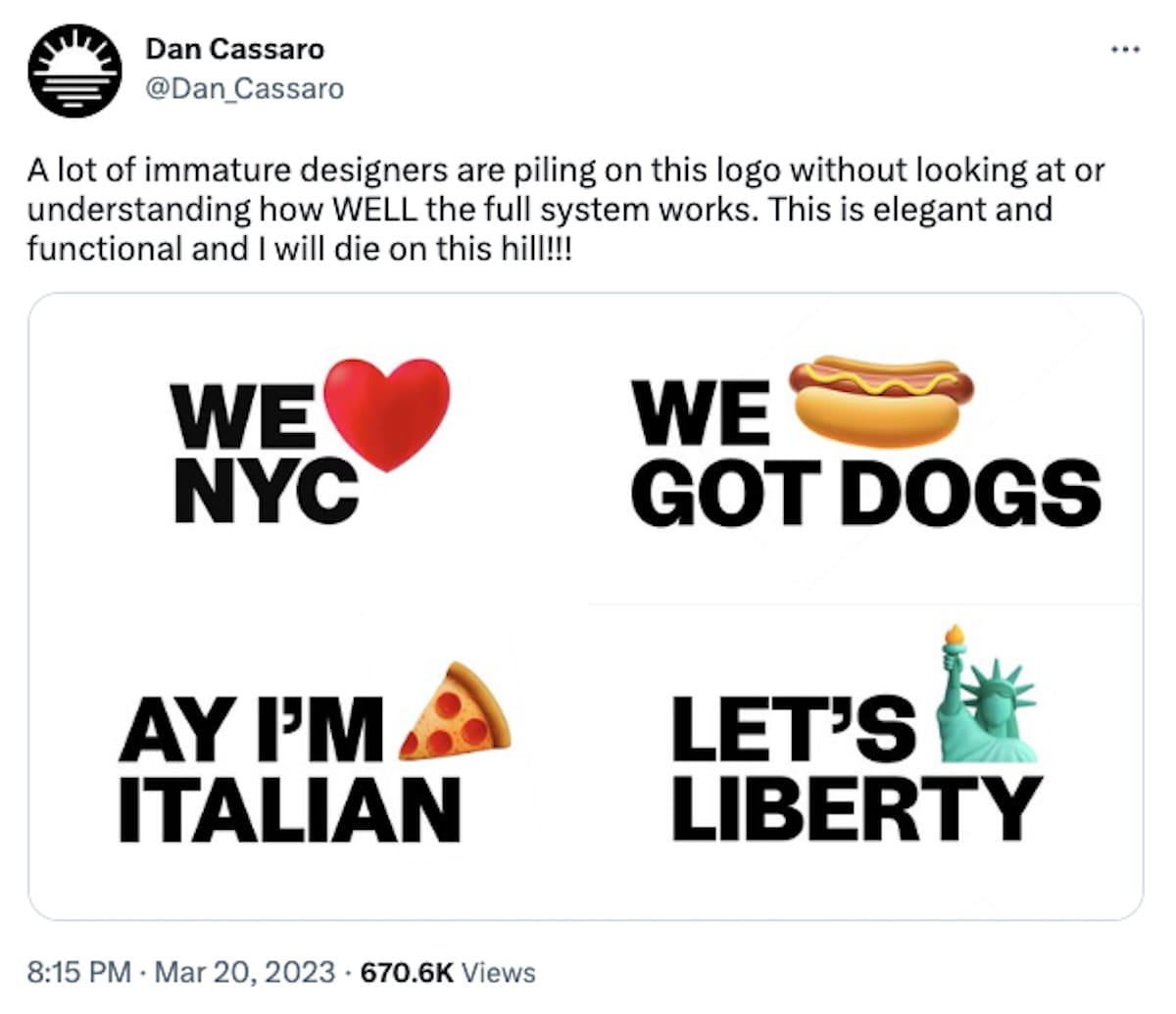 That sarcasm doesn't always translate, as one concerned citizen learned. This week, Dan Cassaro of the independent design studio Young Jerks in Brooklyn tweeted a hilarious send-up of the branding campaign, creating his own version using awkwardly placed emojis and absurd one-liners that reveal the dysfunction and illegibility of the original design. Some people didn't realize his post was satire.