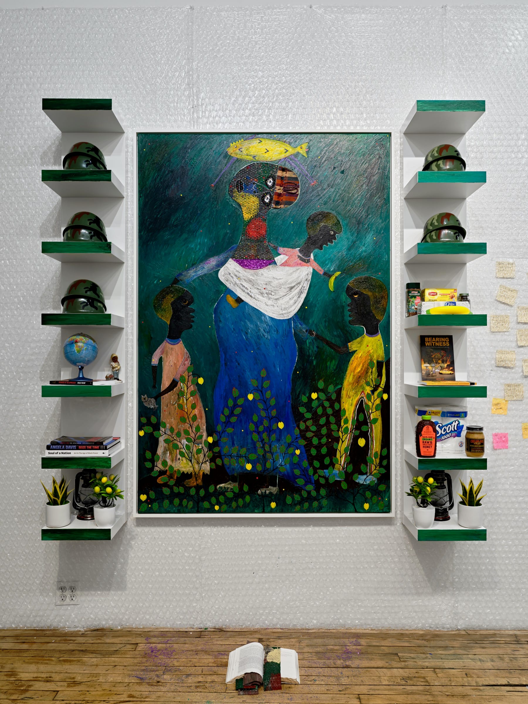 For Adjani Okpu-Egbe, the personal is the political. A native of Ambazonia (formerly South Cameroon), the Afro-Surrealist artist critiques United States and European neocolonialism in the region, calling attention to an ongoing liberation struggle that receives little attention in mainstream media — let alone in contemporary art. Mixed-media paintings of Black mothers and children are flanked by army helmets and consumer products, alluding to extrajudicial killings of Ambazonian workers and the lack of fair trade practices which ensure their poverty. With labels written in the first person, Okpu-Egbe urges us to think through the contradictions of racial capitalism, while remembering to honor the sacred. —Billy Anania