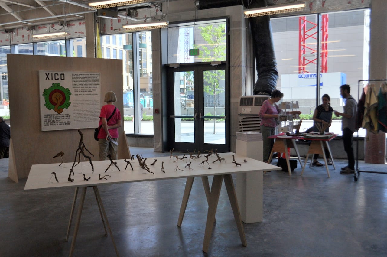 It’s tempting to draw a connection between the growth of the biennial and the widespread changes of the surrounding city. Look at the Google Earth view of the biennial’s area and you’ll find a triangular green space shaped by the intersection of Wewatta and 16th streets — that same space is for the moment home to the Biennial Pavilion, hosted on the first floor of the yet-to-be-finished Triangle Building; by contrast, fly into the 20-year-old Denver International Airport and you’ll land not over buildings but over fields of wheat. From touchdown to downtown, signs of Denver’s sprawling, rapid development and growth pains are everywhere.