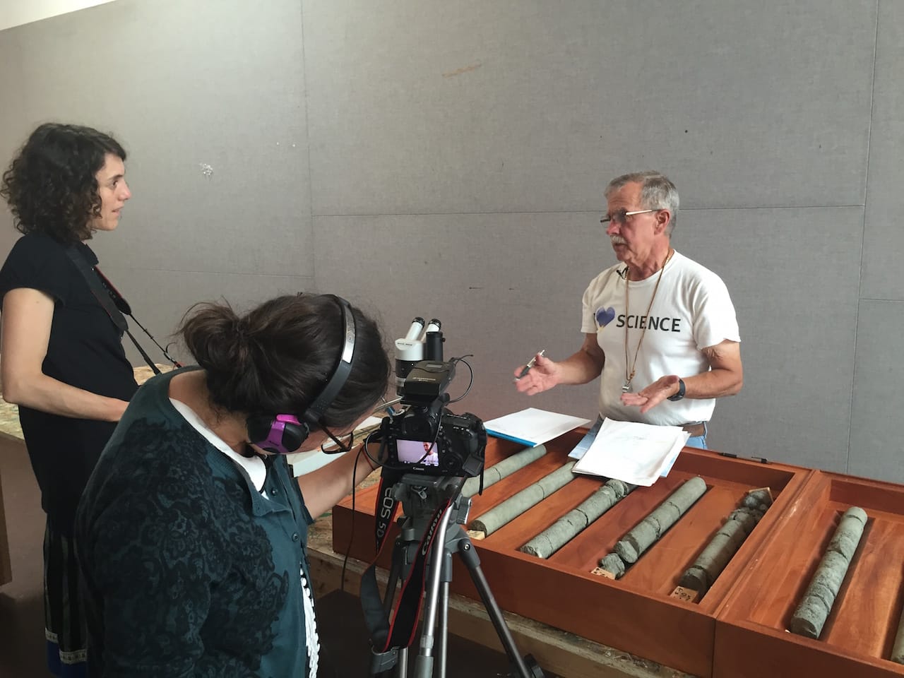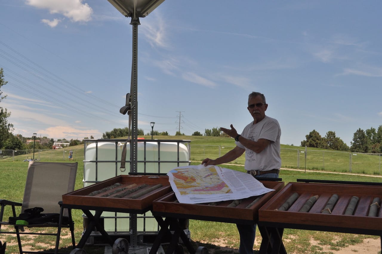 It’s a subject the biennial repeatedly tips its hat to, either explicitly as in works by Kim Allen, Diego Berruecos, and Erick Meyenberg or more subtly as in the many works and projects that refer to the passage of time and the forging of connections, like Marcela Armas’s “Implant,” which will ultimately swap 120-foot-deep core samples from Mexico City and Denver, depositing each city’s dirt in the other’s ground. Recognizing a deep and intimate, yet often fraught connection between Mexico and the US, collaborations between the two (their cities, artists, and histories) recur throughout the biennial that seeks connections in the Americas. Documenting each step along the way, Armas filmed the core excavation and subsequent analysis by geologist Paul E. Belanger, a connoisseur of both rocks and corny science shirts who in a way functioned as Armas’s science-minded surrogate. All this documentation aims to add another layer of perspective, vision, and language to Armas’s project exploring those links and layered histories.