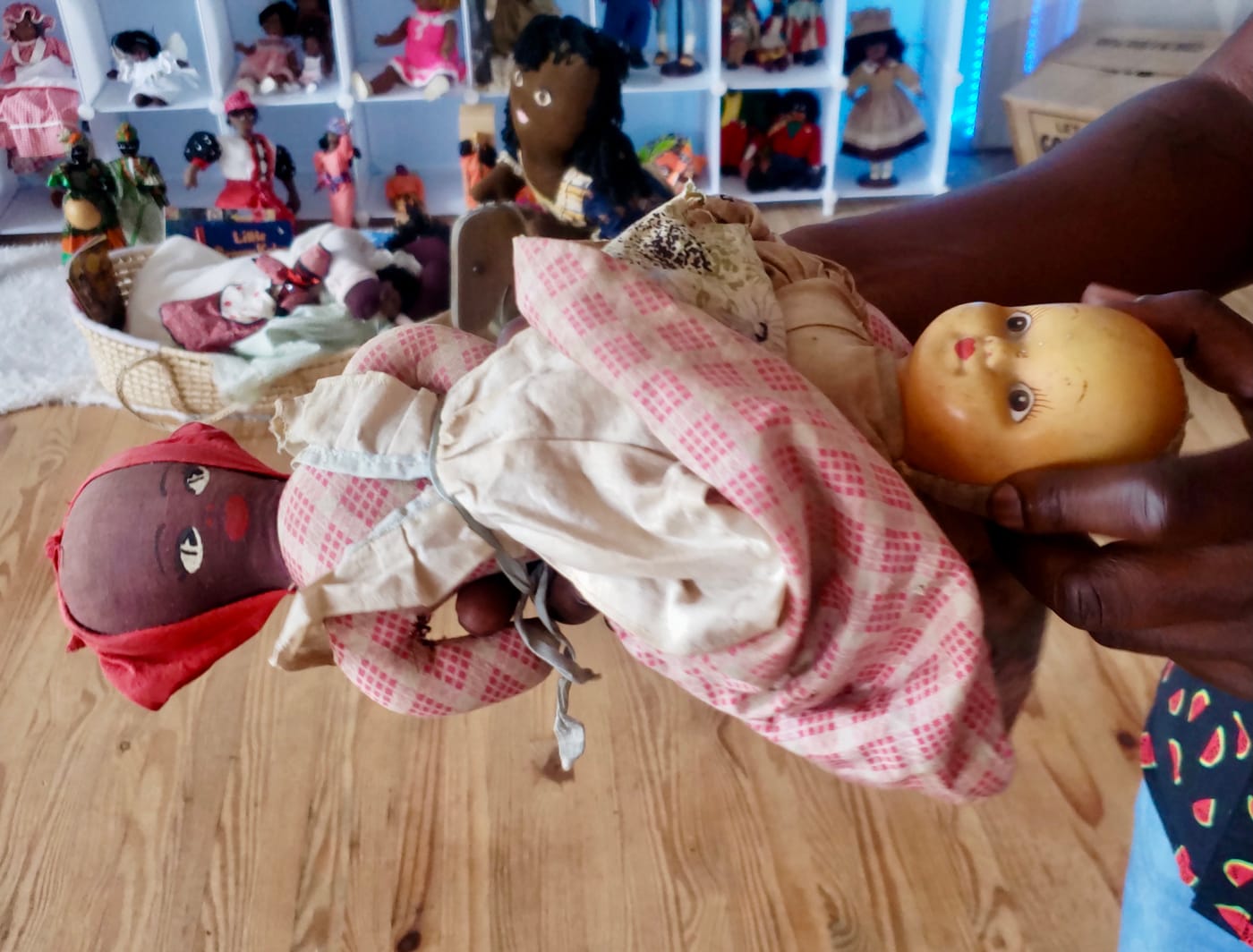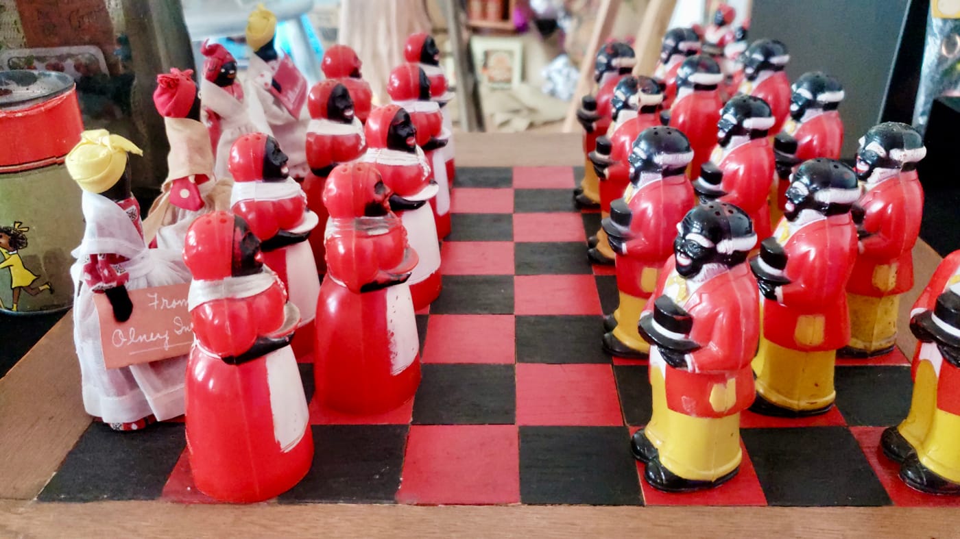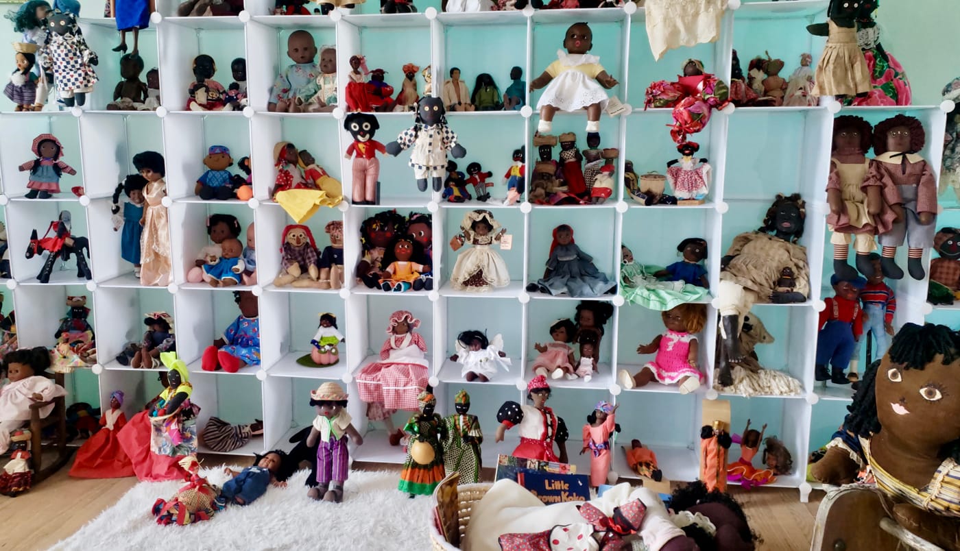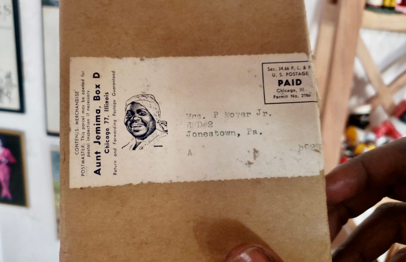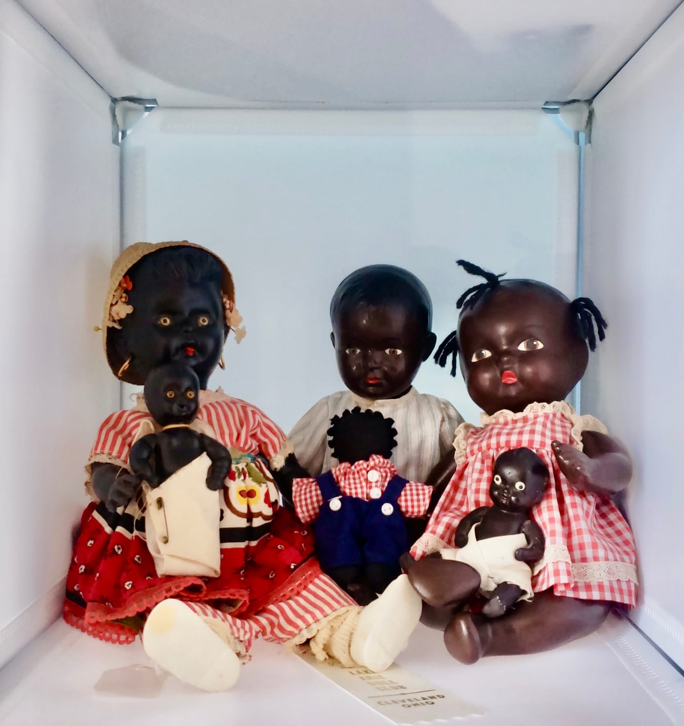 This one-two combo is a move that will repeat itself throughout the nearly hour-long tour Jones gives me of the space. Objects are mainly grouped by similarity, with an area devoted to Africana, another to cotton-picking, watermelon tropes (Jones is dressed in a watermelon-themed button-down that he acquired on his recent trip to Hawaii), toys, and two sections on advertising materials. The back wall of the exhibition is anchored by a cube shelf showcasing dozens of Black dolls — handmade, commercial, old, contemporary, horribly racist, tender depictions, well-loved, completely untouched. There can hardly be a more literal proxy for people than dolls, and seeing these numerous and individual Black bodies stacked into cube spaces cannot help but evoke a specter of Middle Passage, or its contemporary echo, the prison system.