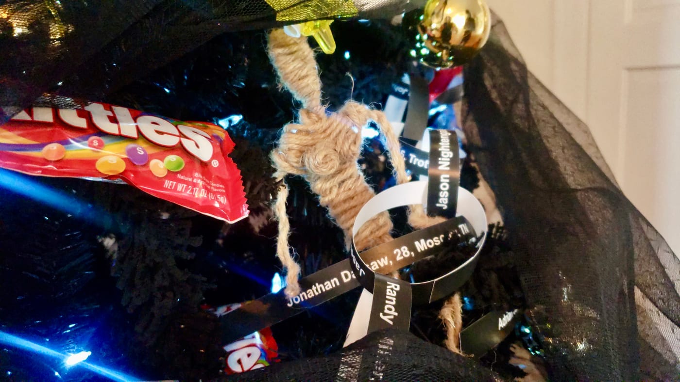 The exhibition opens with “Grandma’s Room,” a bedroom-like installation that is tribute and shrine to the women in Jones’ life — including a bed covered in quilts made by his great-grandmother; walls covered in family photos; and a book of personal histories chronicling members the family since his great-grandfather’s birth in 1852; and post-emancipation move to Tuscaloosa, Alabama. This area serves as a kind of threshold between original works presented in the foyer, including a selection of drawings by Jones’ uncle, Melvin Hardy, who spent a lot of time in the country’s carceral system, and the “Black Christmas Tree” — an all-black synthetic tree decorated with packages of Skittles, water pistols, figures rendered in rope by artist Nyesha Clark Young, and ringed with a paper wreath bearing the names of 229 Black people killed by police between May of 2020 and May of 2021.