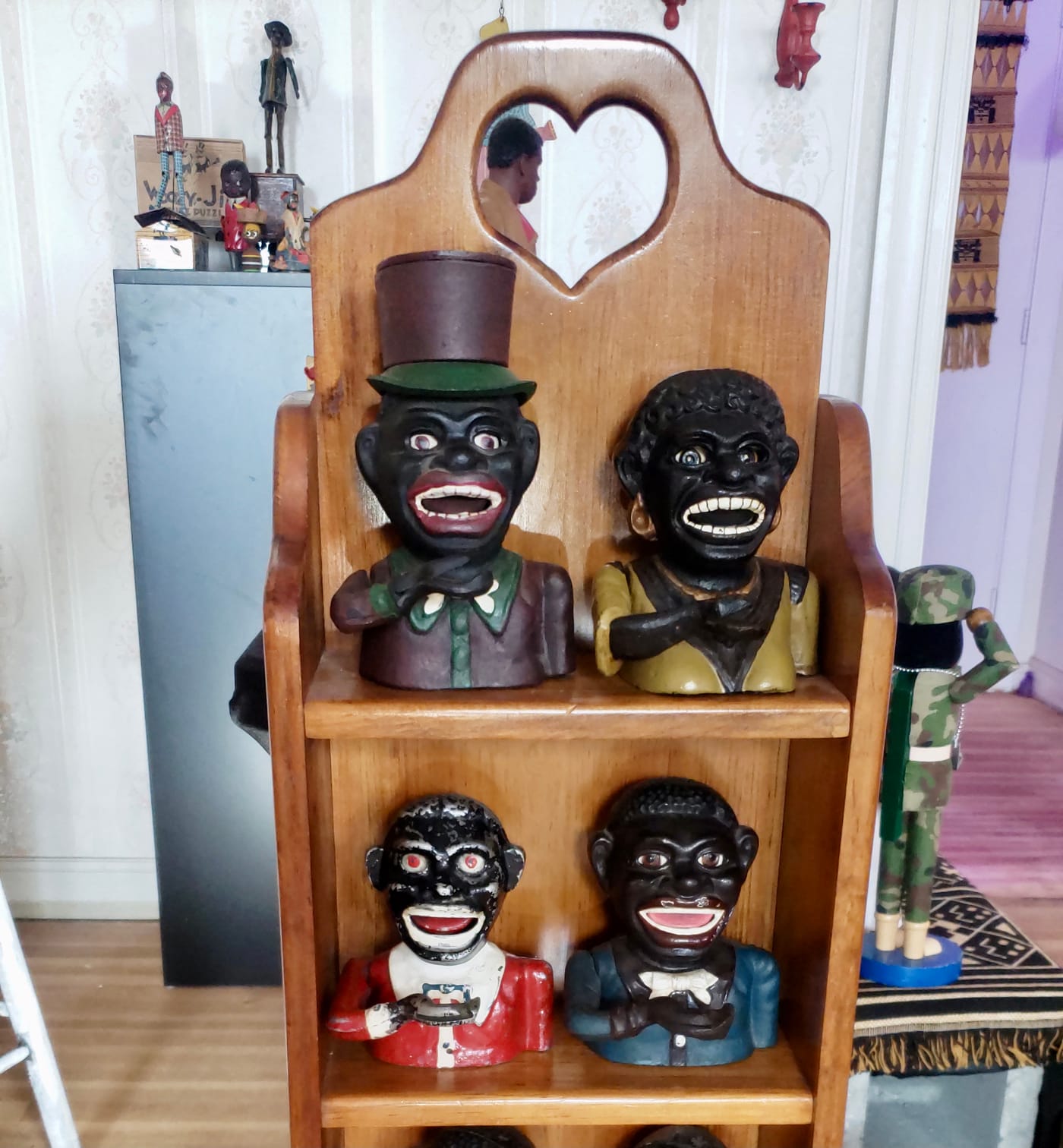 Like the rest of the exhibition, the wall of dolls leverages the extraordinary power of presentation to create a mix of attraction and revulsion. As a neurodivergent viewer particularly prone to object repetition, many parts of the Blactiquing Space hold visual appeal for me in the arrangement of similar or same objects — the racist aesthetics of those objects notwithstanding. This represents a powerful bait-and-switch — being drawn, say, to the symmetry of a shelf lined with high-gloss blackface caricature busts, to have Jones reveal them to be a collection of “Jolly N***** Banks” designed to swallow pennies. And then to have him mention that one of them used to belong to his own grandmother, as a fixture of her home.
