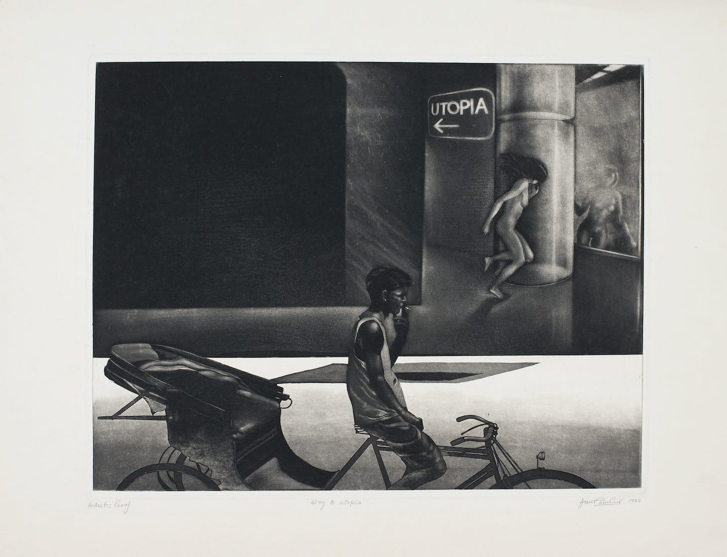 The practice of printmaking is labor-intensive, which is why, for most of our history, it has been seen as a practice primarily associated with men. When Anupam Sud joined the Delhi College of Art in the early 1960s as a student, India went to war with China. When artists Somnath Hore and Jagmohan Chopra were setting up the printmaking department at the college, amidst the Indo-China War (1962), metal plates for etching were hard to acquire, and this environment of thin resources and wide-eyed, artistic idealism shaped Sud’s oeuvre.
