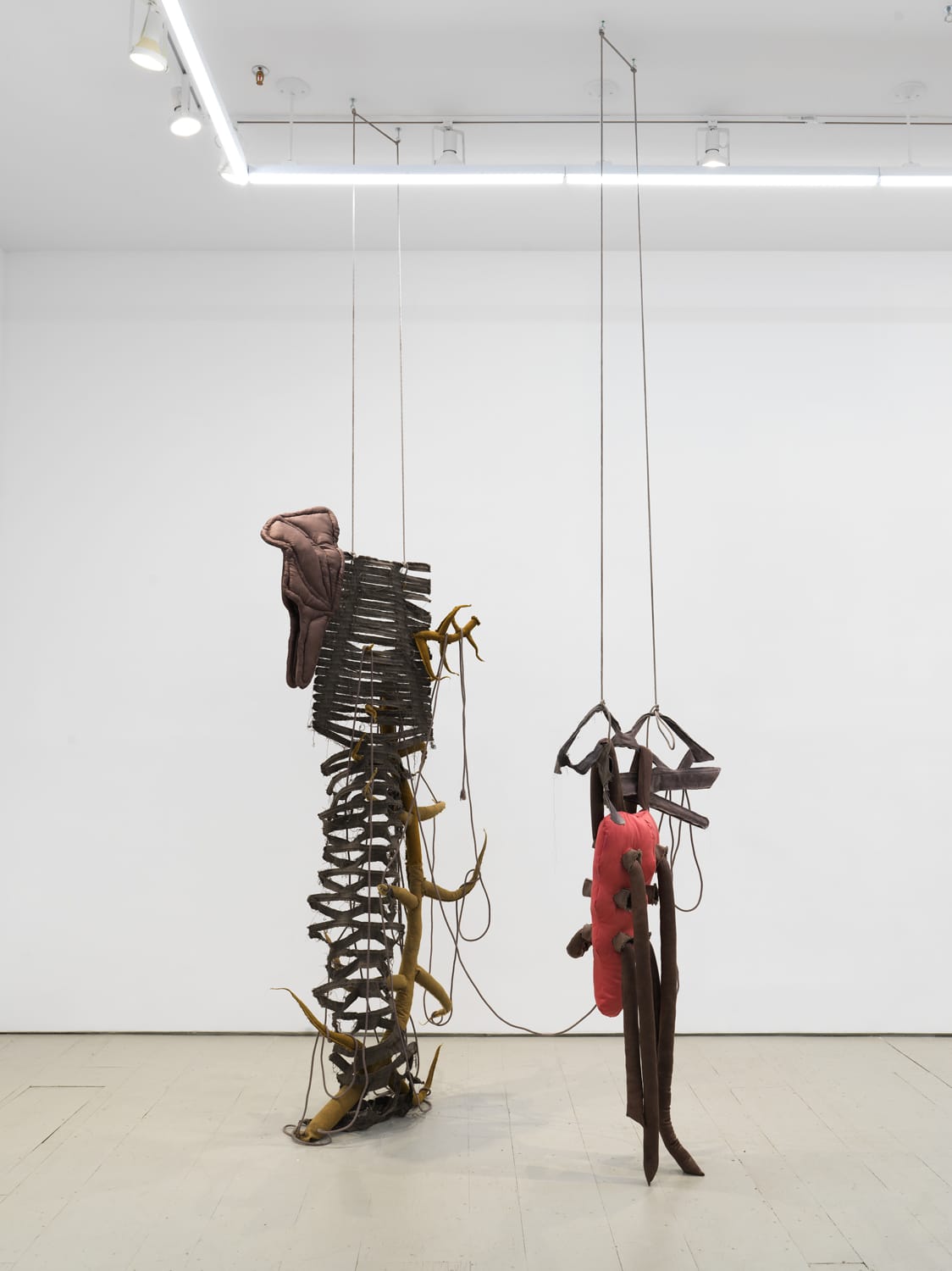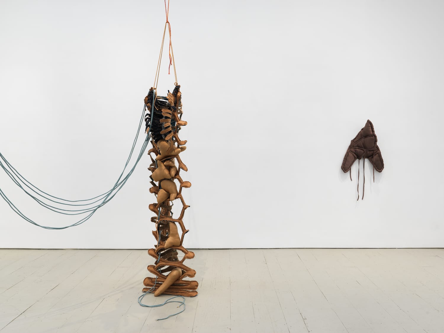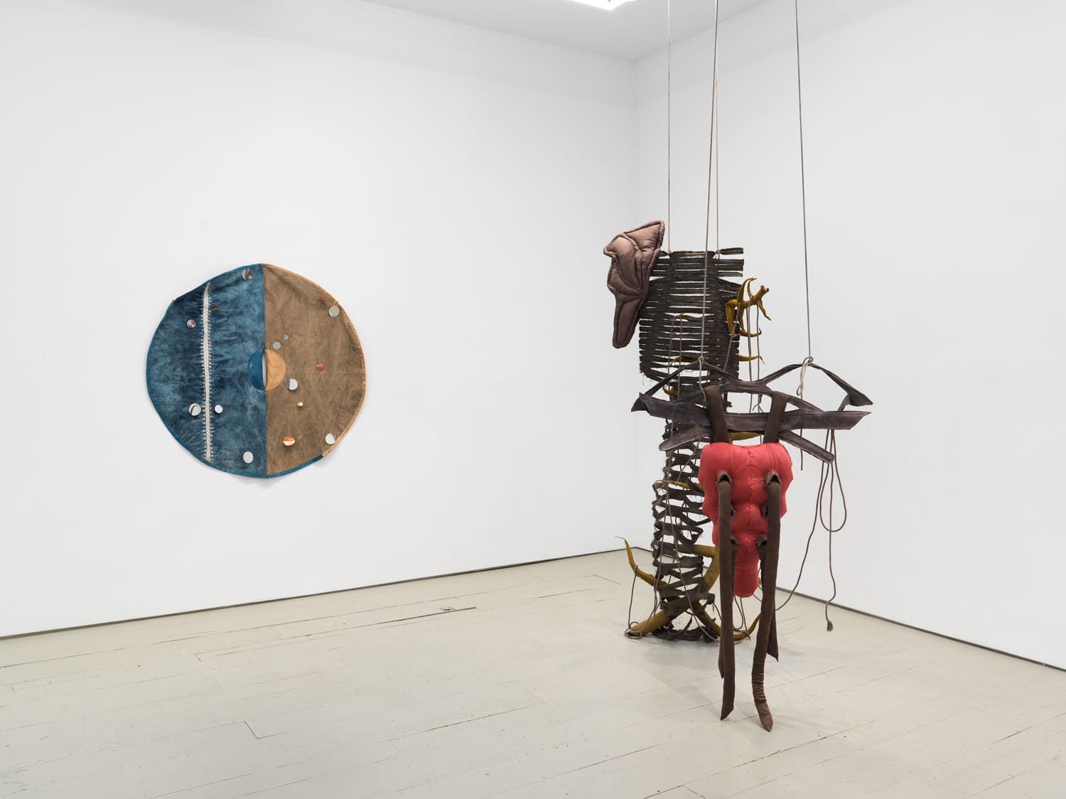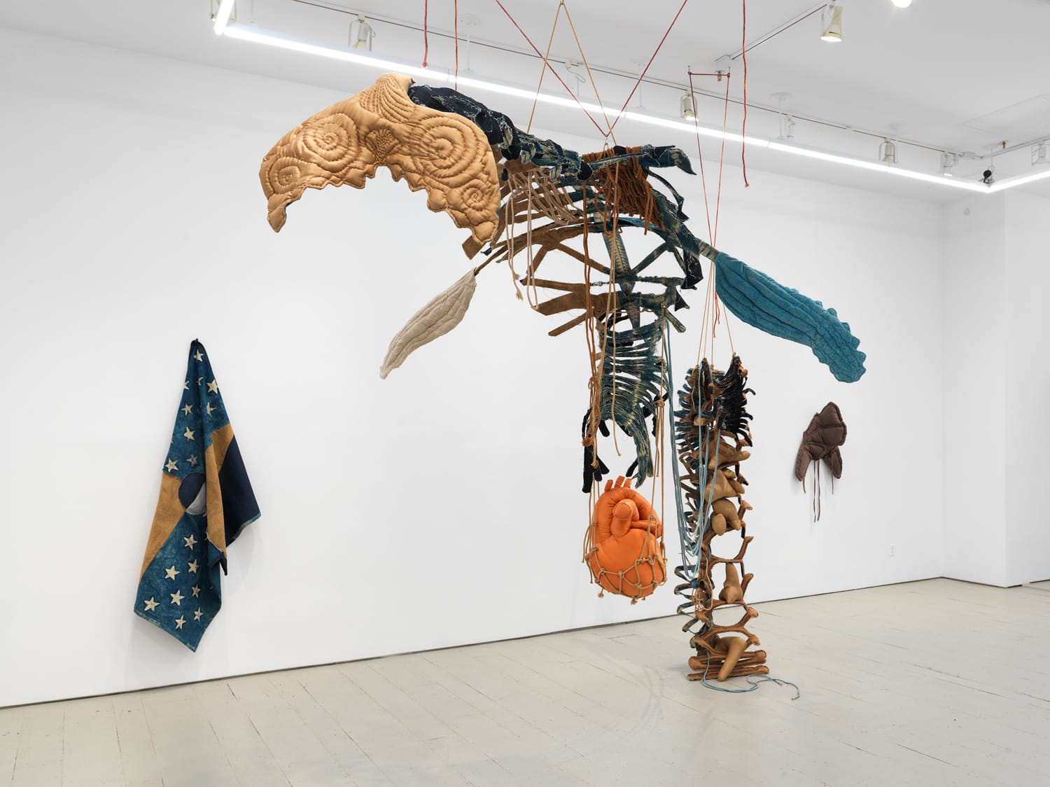 Installation view of Joy Curtis, "Ocean Grandma, Sympathetic/ Parasympathetic, and Future Organs (2022–23), plant dyes on cotton, silk, and hemp; denim, kapok, steel, and bronze wire, 102 x 90 x 144 inches (all images courtesy the artist and Klaus von Nichtssagend gallery)