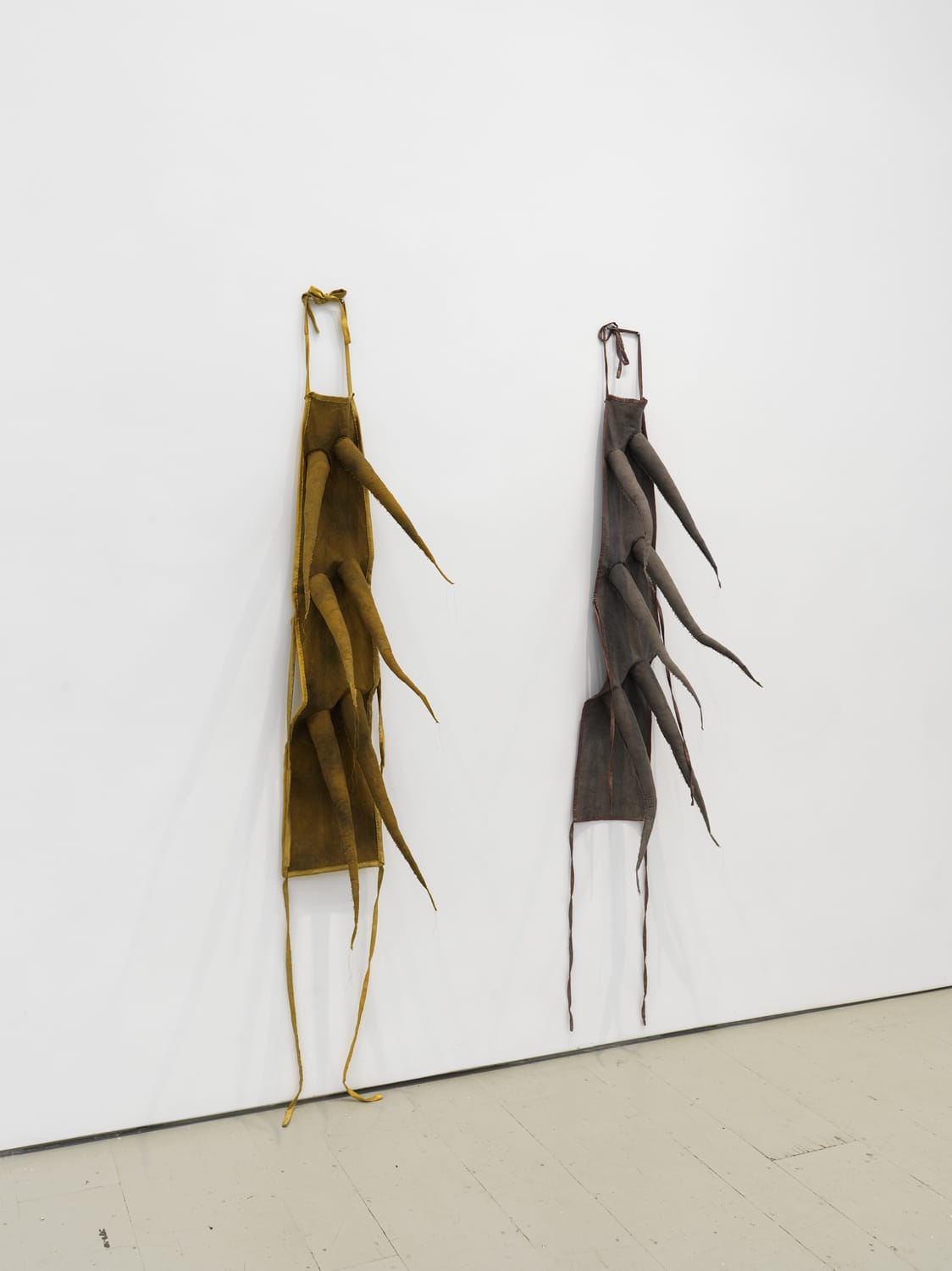 A kind of bone magic pulses through the show: A whale. A ribcage. A poncho composed of sky and earth. These exhibits feel like they belong to a kind of natural history museum of the artist’s inner world. In “Night Hike 1 (Epiphytes)” (2023–24), what appears to be a wearable fabric heart is perforated by a set of six umbilicals, from which some nursing animal might draw sustenance. Perhaps they are meant for us gallery-going mammals, wading through the often sterile spaces where art is exhibited, seeking nourishment.