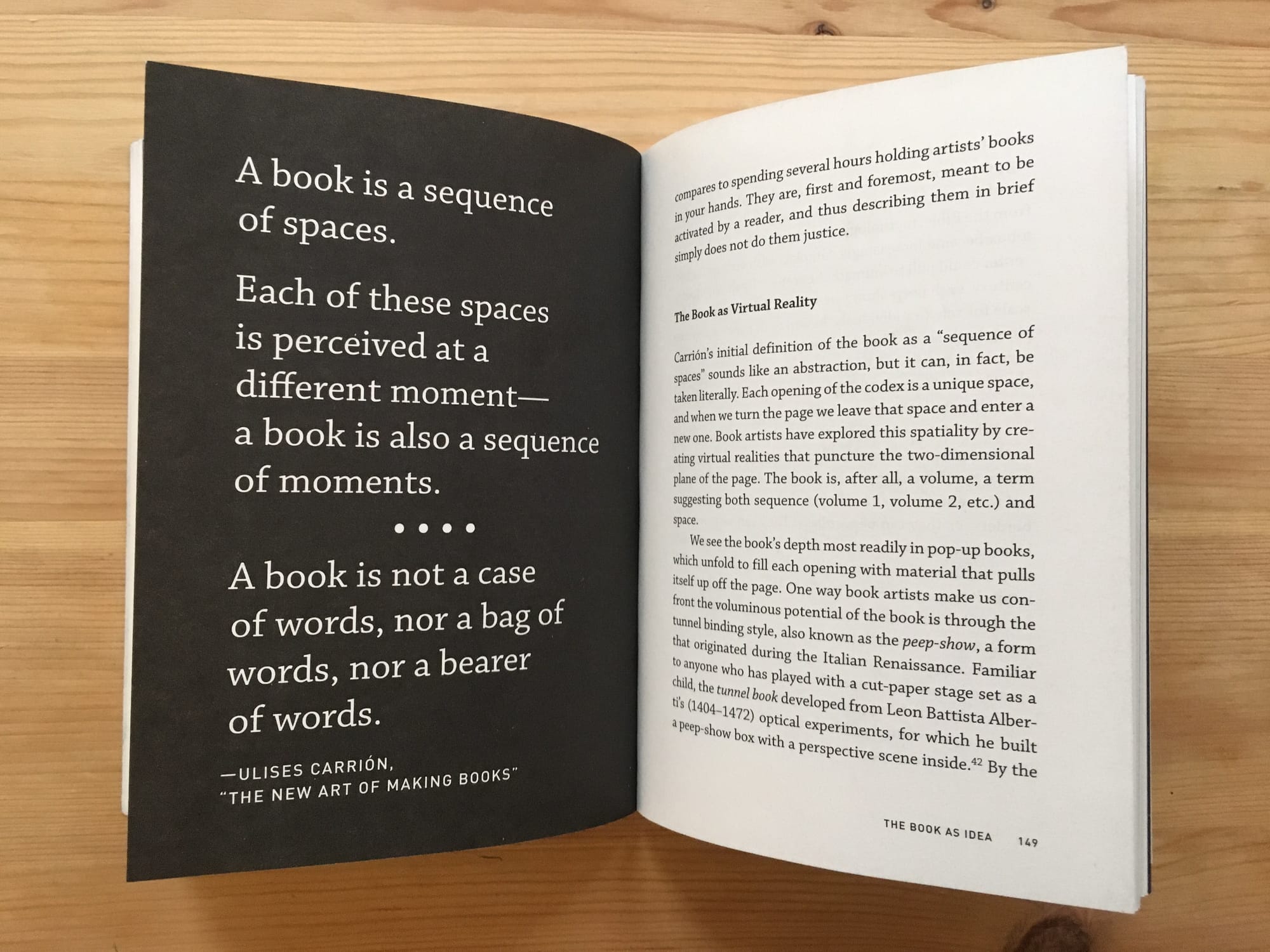 Borsuk traces electronic literature as well, from Brewster Kahle’s founding of the Internet Archive in 1996 to the Google Print initiative in 2004 (which became Google Books) and the iPhone and Amazon Kindle releases in 2007. As with her other accounts, this evolution is not a straight line, but one that changes as reading needs, alongside formats and cultural conceptions of a book, change. As she notes near the end, “All books, I hope this volume suggests, arise in the moment of reception, in the hands, eyes, ears, and mind of the reader.” Just as the oral tradition needs an orator, a book needs a reader to be activated. Even the most conceptual examples of art books play with the performative aspect of words waiting to be read. Books are physical objects whose properties dictate these experiences. “Both we and the texts we read have bodies, and it is only when they come together that a book takes shape.” With many of us today carrying reading devices in our pockets, and the potential of books to take so many forms at the click of a button, the real question is not what will the book become, but what its readers will become.
