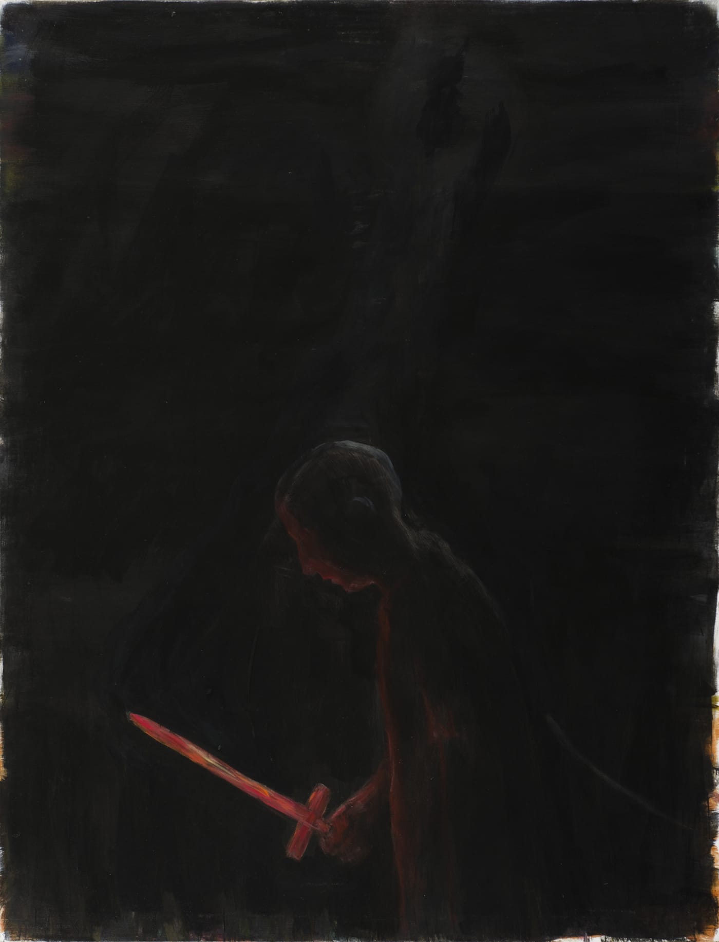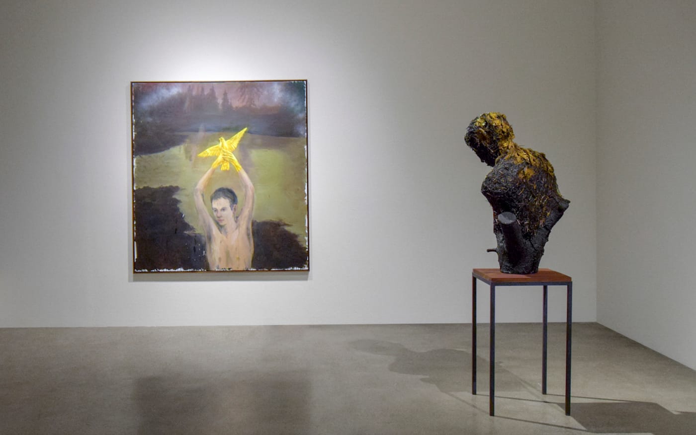 In Frost’s A Witness Tree the wood does not bend; it marks and supports its space firmly like “an iron spine,” despite the passage of time or maybe as a product of it. The permanence of the tree as witness in Martínez Celaya’s paintings is countered by the ever-changing boy — both primary signifiers in his work. Capturing the vicissitudes of time is one of the ways in which Martínez Celaya creates uncertainty. In “The Holy” (2009) and “The Sword” (2012) bright colors whisper from the edge of the canvas, buried under darker pigments, like a memory. The flowering field persists in the fray of “The Sword,” beckoning the viewer to imagine its life before it was cut down and burned black. When Frost describes the land in “The Quest of the Purple-Fringed,” he notes “the chill of the meadow underfoot” despite the sun overhead. The reader can recall how it feels when soil covets the cool night air well into daytime. Martínez Celaya’s scorched land prickles while slumbering, teasing us with the image of how the green plants’ limber stems previously swayed.