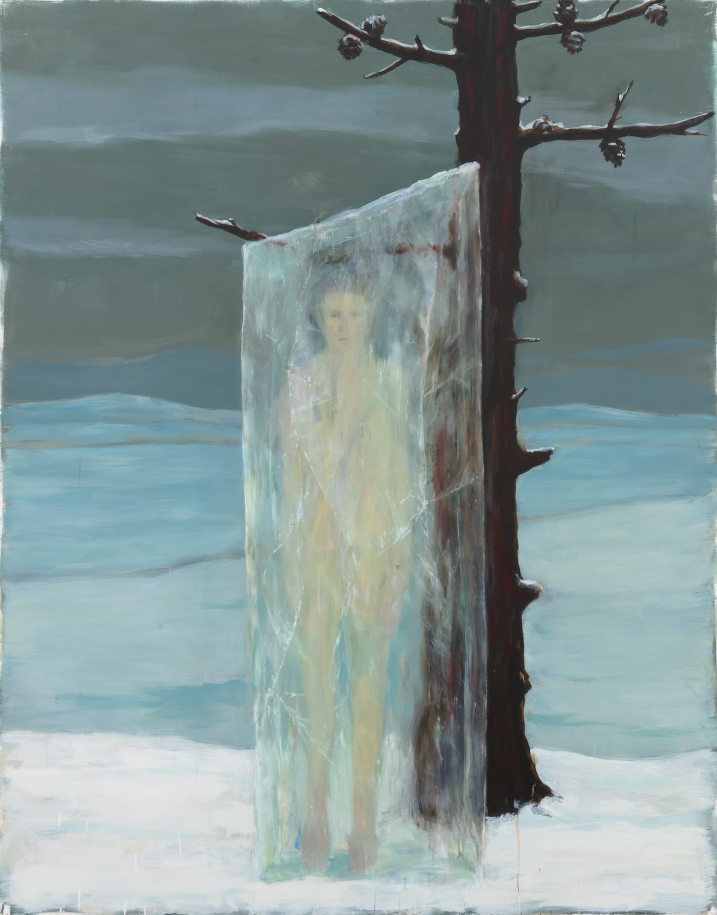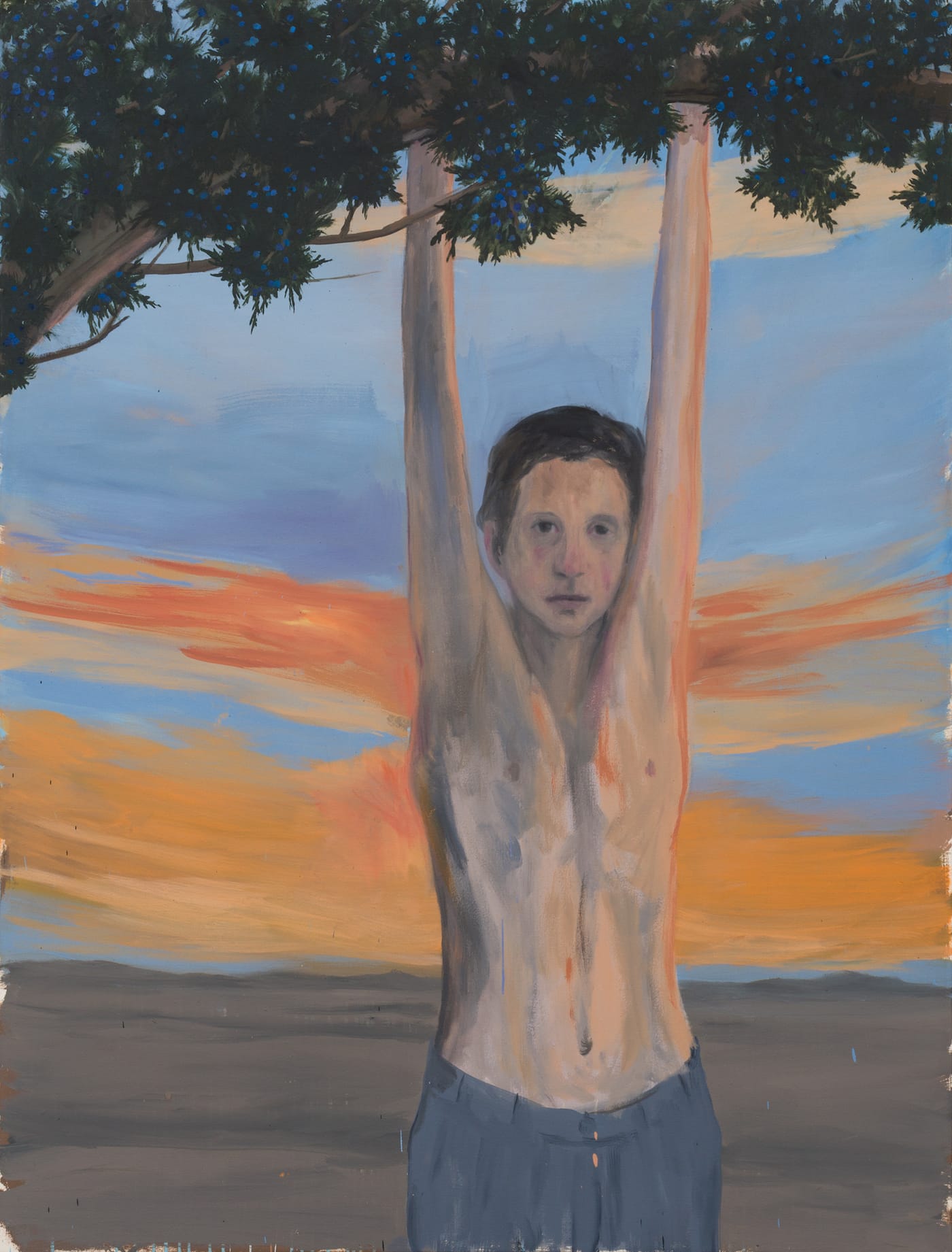 Frost described the wings of a butterfly (“The Tuft of Flowers”), the pages in an open book (“A Cloud Shadow”), and the surface of water in the wind (“A Line-Storm Song”) all as a “flutter.” Rather than argue Frost is in need of a thesaurus, I would suggest it is the movement that evokes an image in the mind, rather than the actual thing moving. Extending the possibilities of a sensation is also what interests Martínez Celaya, such as when he presents one more creature that flutters in “The Relic and the Pure” (2013–2015), where a boy rests on the belly of a ray rather than a raptor. A hint or a gesture can shift everything within Martínez Celaya’s frame. A young boy stretching from a branch possesses an impossibly long torso in “The Prince” (2015). His rubbery adolescent body, with one protruding shoulder blade that bends the sky, conveys an anxiety that extends beyond what is literally depicted.