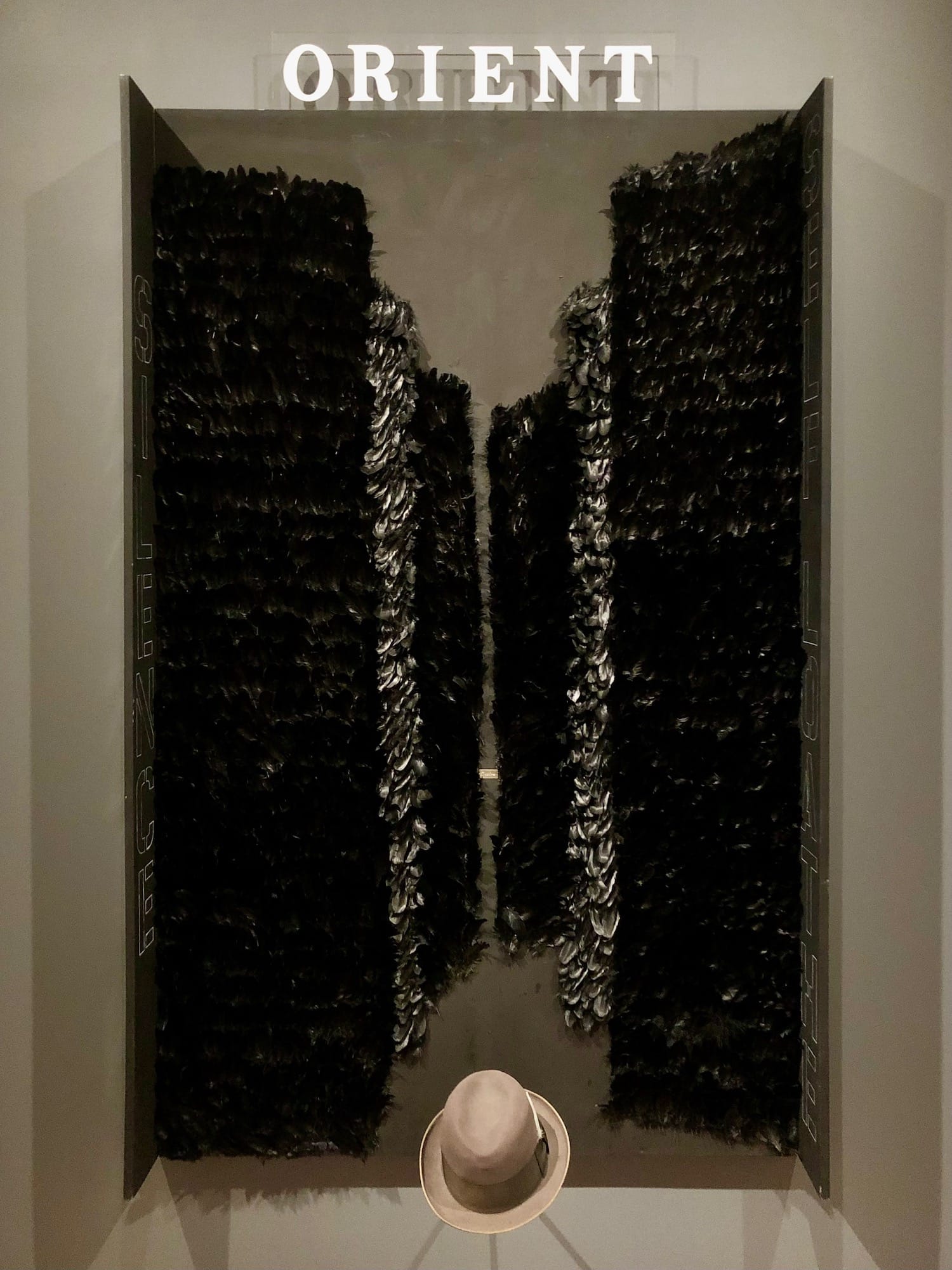 Among the works in the series is “My Father Walking Up Kearny Street for the First Time” (1995), which features a gray fedora in the foreground set against towers of black feathers receding into the focal point of a miniature bronze plate engraved with the word “desire.” In this scene, the immigrant chases a distant object of desire through the menacing urban jungle. Stenciled words evoke the immigrant’s internal tension: “ORIENT,” “SILENCE,” “SELF LOATHE,” “PRESSING,” “PRESSURE.”