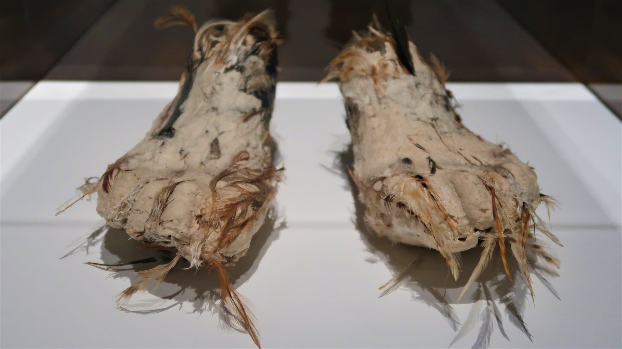Hanging by the gallery’s entrance, “Painted Cloak” (1971) commands attention: an unstretched canvas cut in a semicircle to resemble unfurled wings, its surface is airbrushed with a hypnotic, coiling pattern accented by tufts of feathers; a contrasting royal blue and purple taffeta lining bears impressions of the artist’s hands. Like the casts of “Artist’s Feet” (1979-80) displayed nearby, the vestment may be uninhabited, but it’s not inert. Its organic materiality conjures a visceral, even metaphysical awareness. Villa’s invention is on full display in this work, yet it has only received due attention in recent years. (Most notably, his works were included in the 2019 Singapore Biennale by Filipino artistic director Patrick Flores.)