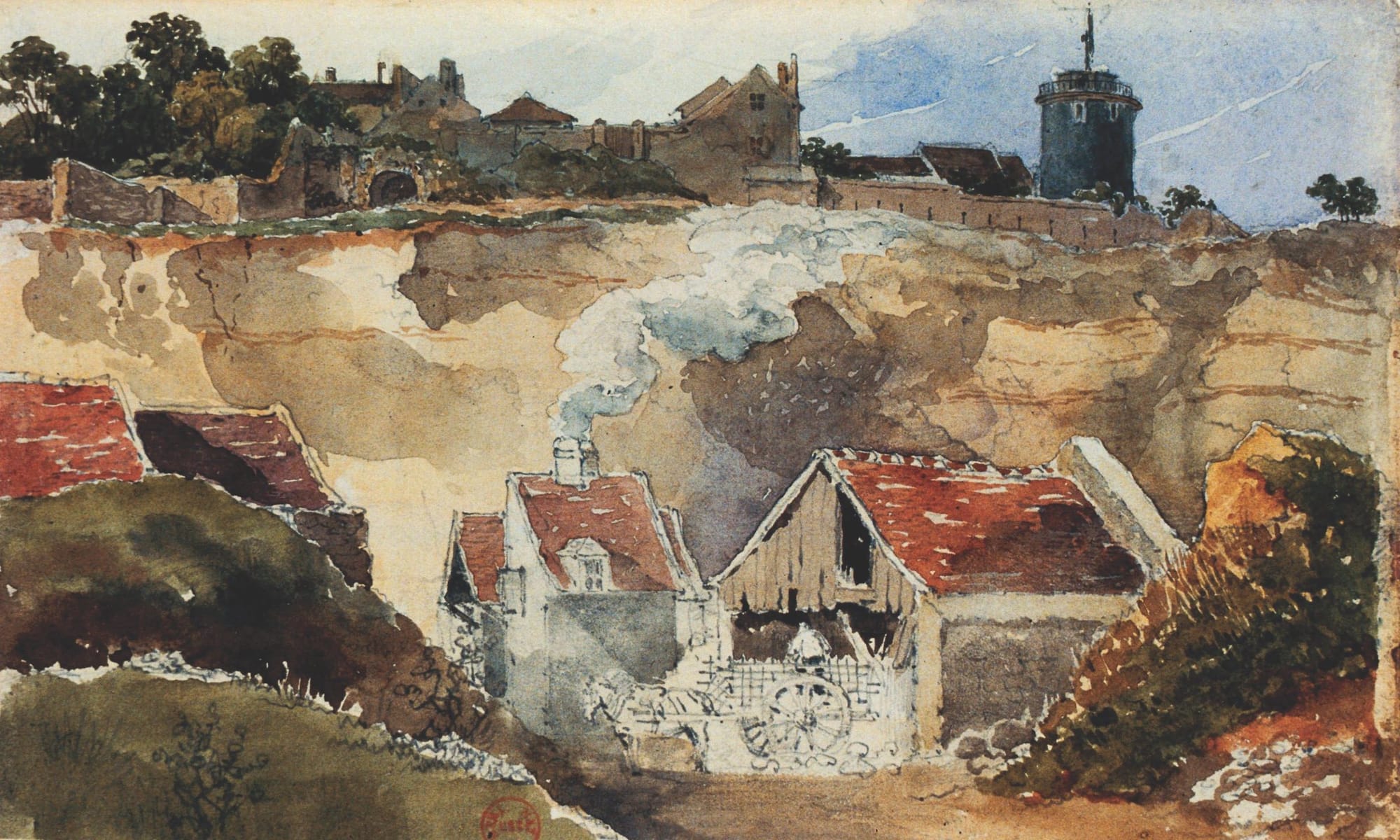 Taws forefronts three lesser studied genre painters: Jacques François Joseph Swebach-Desfontaines, Étienne Bouhot, and Georges Michel. Especially fascinating are Michel’s later 19th-century works like “View of the Butte Montmartre with the Church of Saint Pierre and Vue de Montmartre,” where the artist merges the iconography of hazy telegraphs with bleak cloudy skies — a timely representation of France’s evolving landscape affected by environmental and technological change. The telegraph has also been visually represented in various styles of art, including Honoré Daumier’s lithographs, J. J. Grandville and Charles Norry’s drawings, Louis Pierre Baltard’s etchings, and several caricatures.