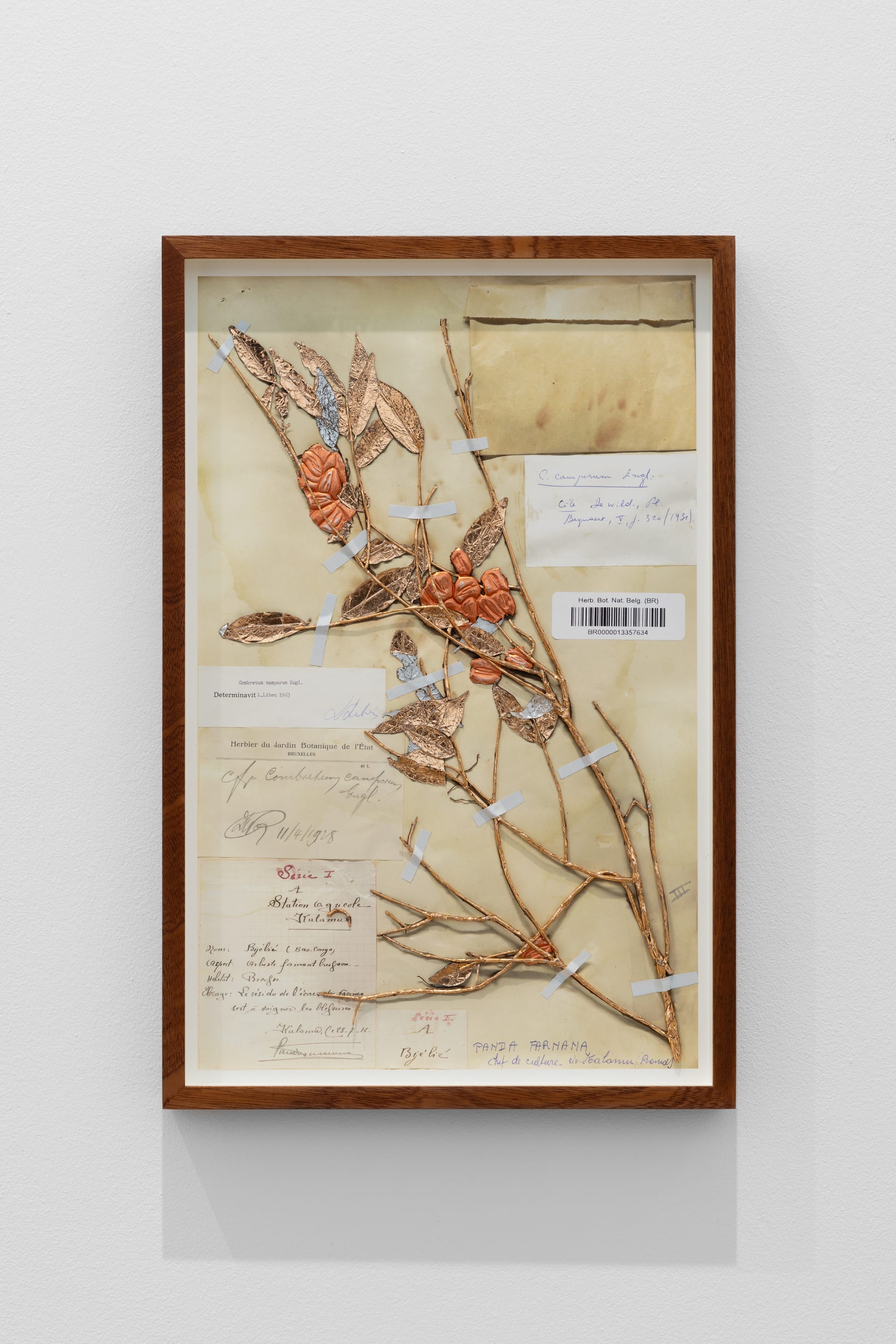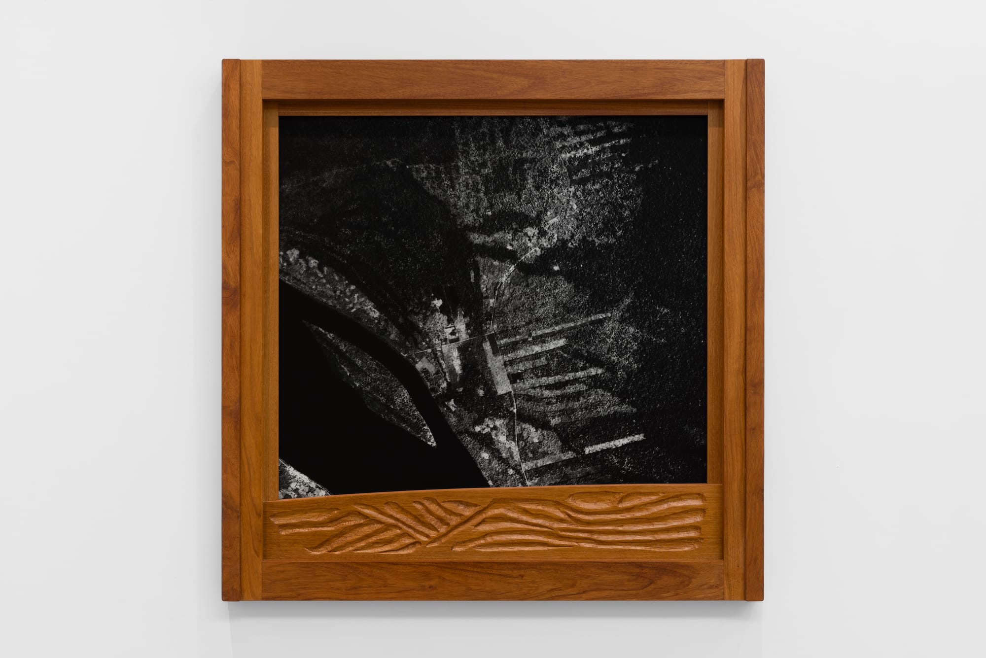 For instance, the exhibition opens with the newly commissioned work “Still Kongo I-V” (2024), which consists of five aerial photographs of dense forest in Yangambi, Congo, drawn from the archives of the Royal Museum for Central Africa in Tervuren. The images show how Belgium mapped, territorialized, and designated Congolese land as resource rather than ecosystem. Through comparisons with earlier and later photographs, these images further chart the environmental damage wreaked on these forests through logging and mining. The photographs are displayed in specially designed frames of afzelia wood, carved with Congolese motifs appropriated by the Belgian Art Nouveau movement. By merging these elements, Baloji effectively demonstrates how the architectural movement — and implicitly, Belgium as a country and culture — was underpinned in economic as well as aesthetic terms by the colonization of the Congo.