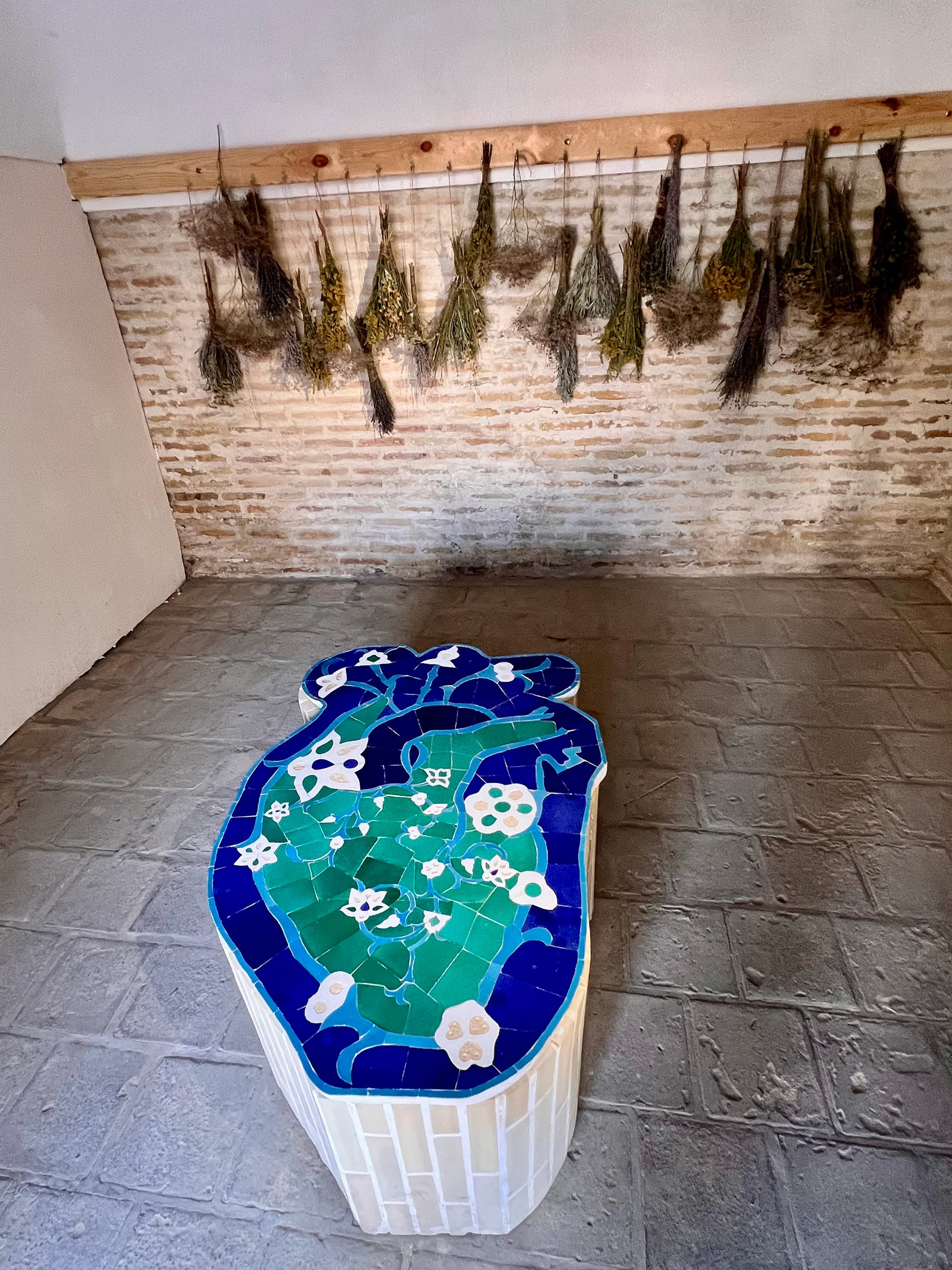 Another impressive work that spans multiple locations is “Eight Lives” (2024–25) by Oyjon Khayrullaeva in collaboration with Raxmon Toirov and Rauf Taxiro, all Uzbek artists. Its three pieces use Uzbekistan's traditional blue ceramics to reference intergenerational female networks of care in Bukharian culture. They feature an oversized liver, lung, and heart with medical herbs selected by Khayrullaeva's grandmother and a Bukharian herbalist.