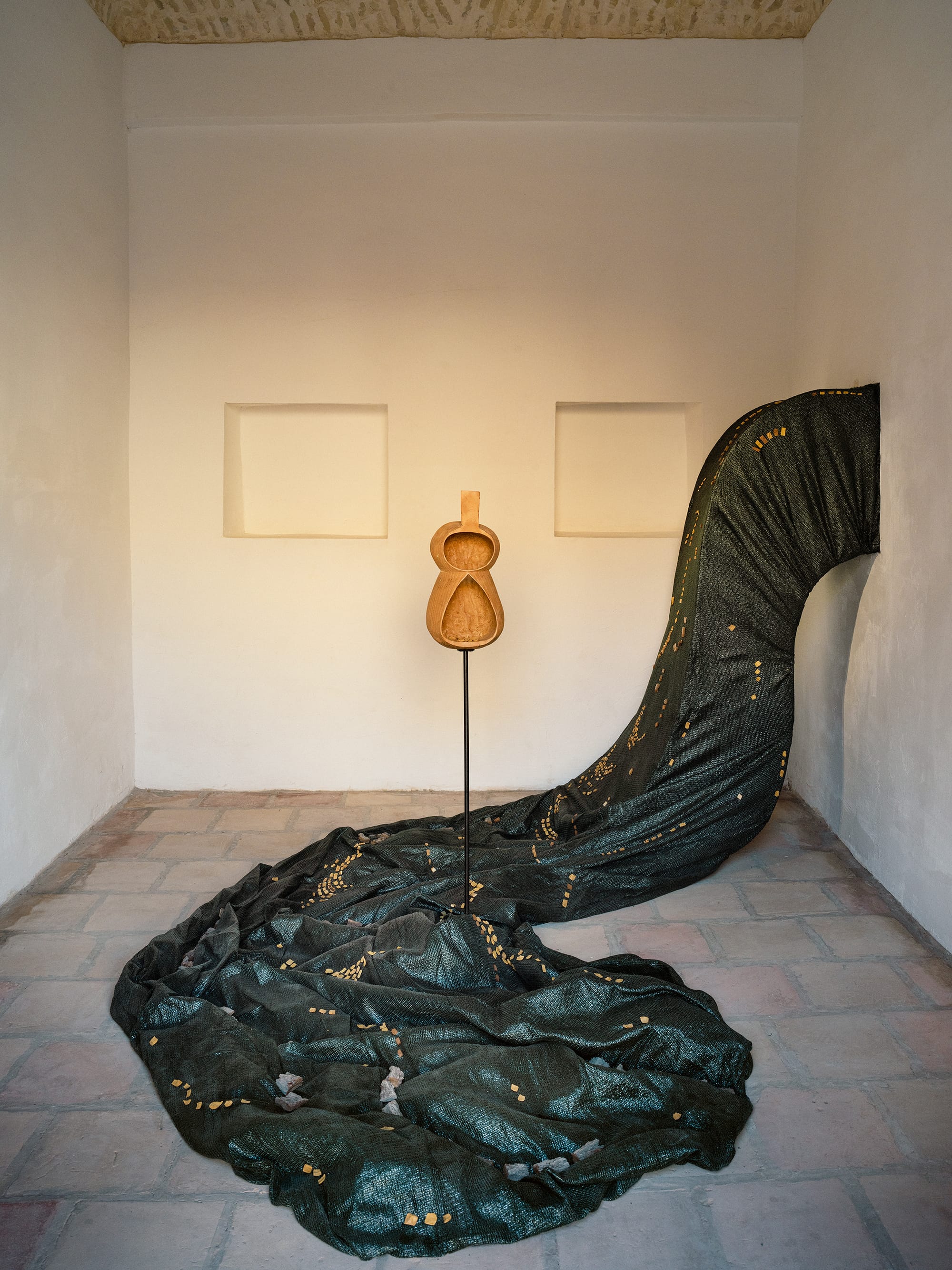 “Under the Mulberry Tree, the Wind Sang Our Names” (2024–25), spanning three rooms inside the former Rashid Madrasa, was one such work. The piece by Hera Büyüktasciyan, a Turkish artist of Armenian ethnicity, and Uzbek artist Isiom Khudoyberdiev features distorted black forms with half-finished musical instruments carved from mulberry wood. The otherworldly soundscape thuds, wails, and clangs. Büyüktasciyan wrote in the wall text, "Coming to this land of mulberry trees resonated with cycles of sacrifice, skin-changing and coexistence. Reminiscing of my great grandmother, a silkworm farmer from Bardizag, I wanted to look at the mulberry tree as a vessel through musical instruments carved through its body.” The artist uses the Indigenous Armenian name for the town of Bardizag, now renamed Bahgecik by the Turkish government. As a Turkish citizen, Büyüktasciyan is making work possibly referencing the Armenian Genocide, which is still denied and forbidden in public discourse in her country.