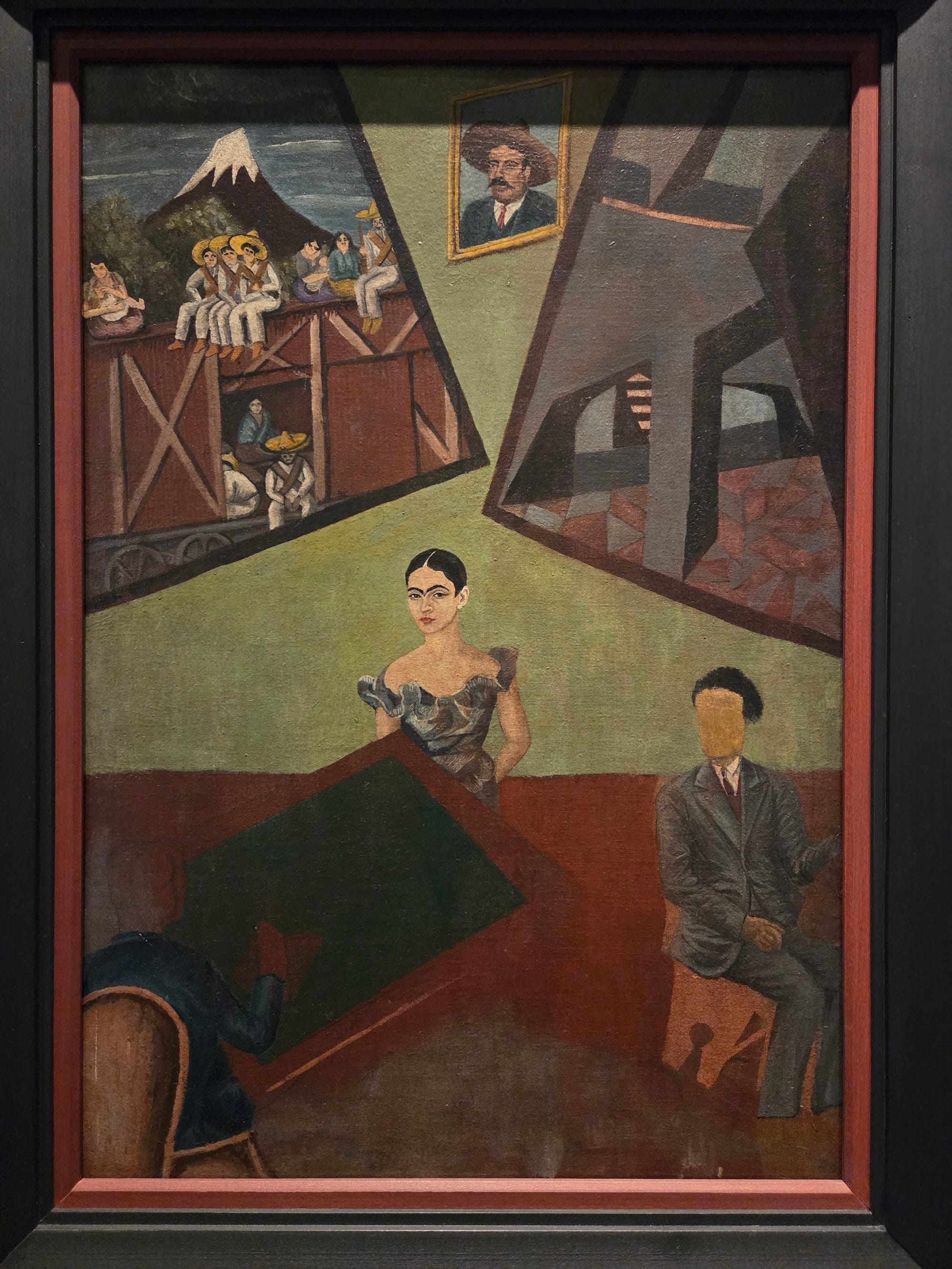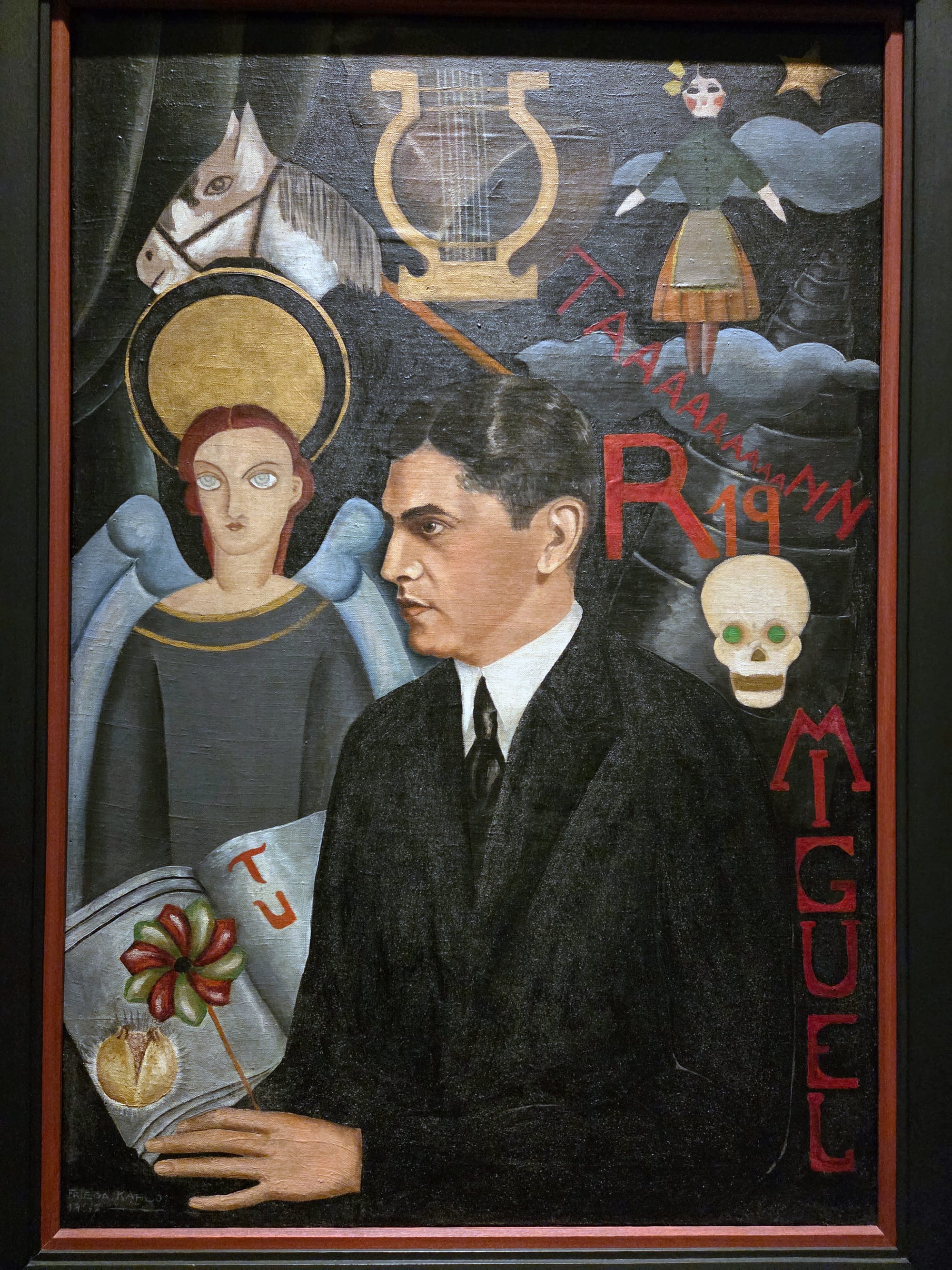 The section “Early Experimentation” displays four of Kahlo’s works from the mid-1920s, made during her student years, alongside two family photos. Here, Kahlo was finding her voice, and not all of her experiments were successful, including her brief foray into Cubism in “Untitled (known as Pancho Villa y Adelita)” (1927). Kahlo’s stylistic interest in Mannerist Renaissance portraiture, on the other hand, is a revelation, as seen in works that showcase shallow depths of field and delicate linearities.