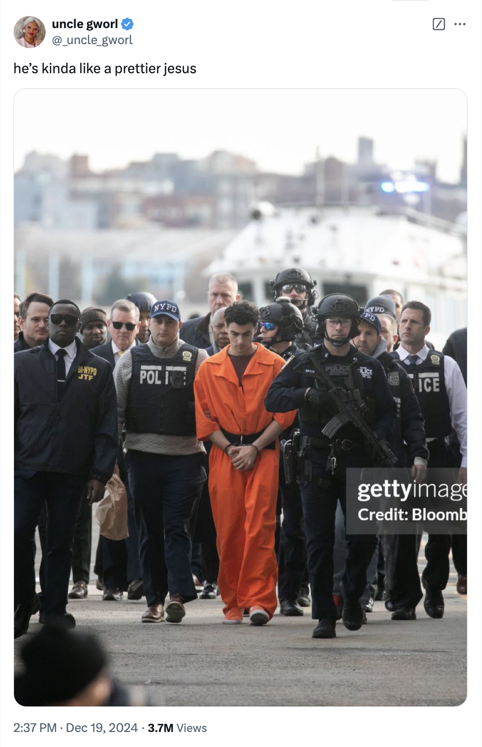 Yesterday, the New York Police Department released photos of Luigi Mangione's extradition to New York City. The accused murderer of UnitedHealthcare CEO Brian Thompson appears in prison-jumpsuit orange, a speck of color surrounded by a phalanx of gray-garbed and grim-visaged police officers brandishing semi-automatic weapons. Behind him, no doubt excited for the photo op, is indicted Mayor Eric Adams. The intention behind the photograph seems clear: Any violence enacted against the corporate state will be met with overwhelming force, and Mangione — a man with no history of previous violence nor a single criminal conviction — is so dangerous that he requires a veritable army to restrain him.