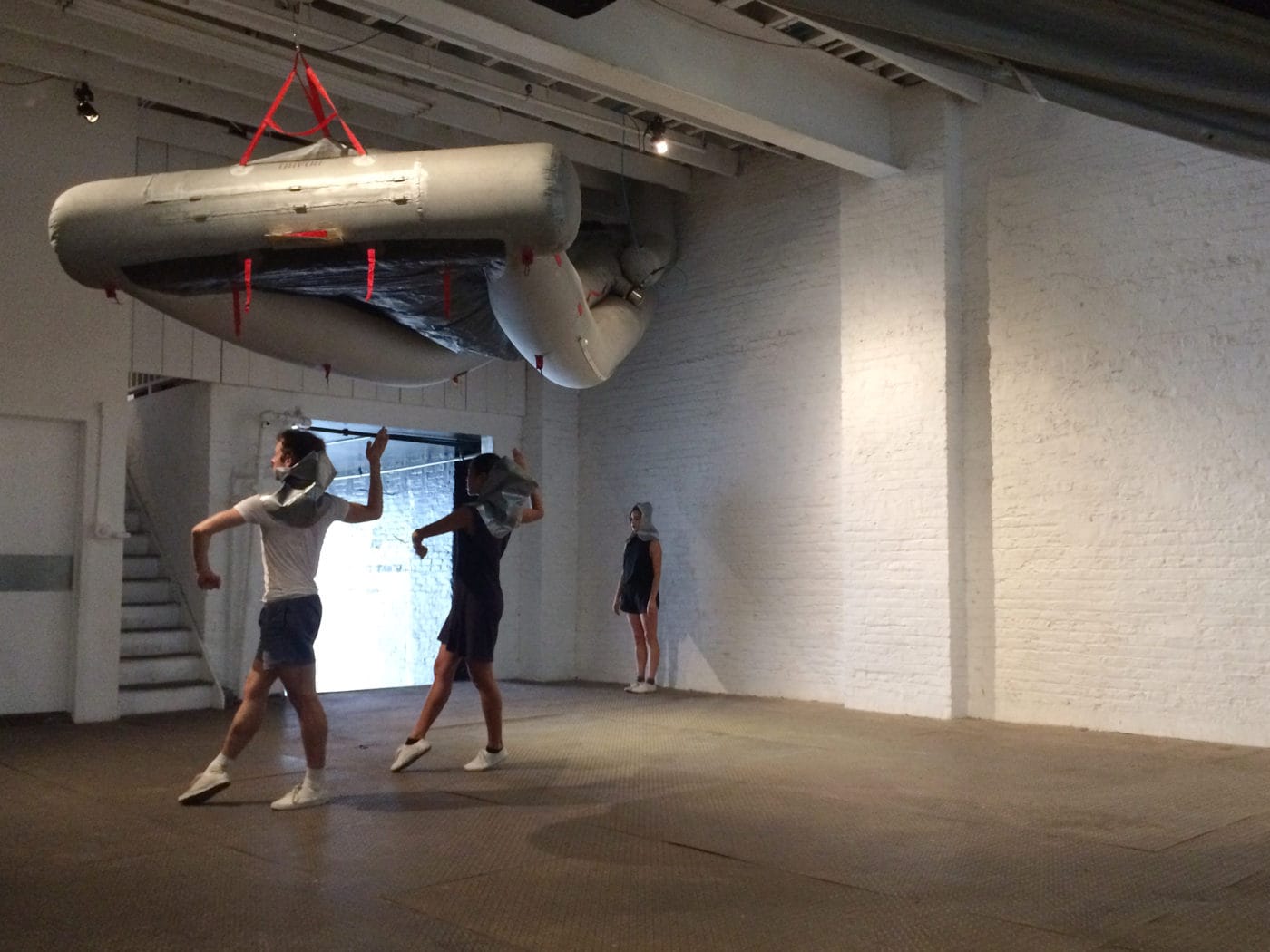 Hollander has staged the most fun-filled safety drill I’ve ever witnessed. Wearing silver, fire-retardant headgear that gives them a kooky, galactic appearance, the performers dance beneath three inflated airplane evacuation slides, two of which hang from the ceiling like blimps. The props are the only blatant allusions to danger, but other suggestions of crisis emerge in the choreography itself, as the dancers combine emergency hand signals with more graceful gestures. Accompanied by an original score provided by $3.33 — the project of electronic music producer Celia Hollander, Madeline’s sister — they twirl, lunge, hop, and pivot as they trace the room, making fanning motions with their arms, crossing them, or extending them as if in warning. The score by $3.33 often incorporates the loud but soothing drone of an airplane’s engines and, at times, the geometry of the performers’s bodies and movements resembles the shape of those flying machines, too, or the blades of a propeller. But any original safety meaning any signal may be intended to connote is lost within Hollander’s fine blending of elegant ballerina and stiff, ground marshaller choreography, which captivates through sheer repetition. We’re always impatient for real-life drills to end — and while I watched this animated one for just 30 minutes, I could easily have stayed for hours.