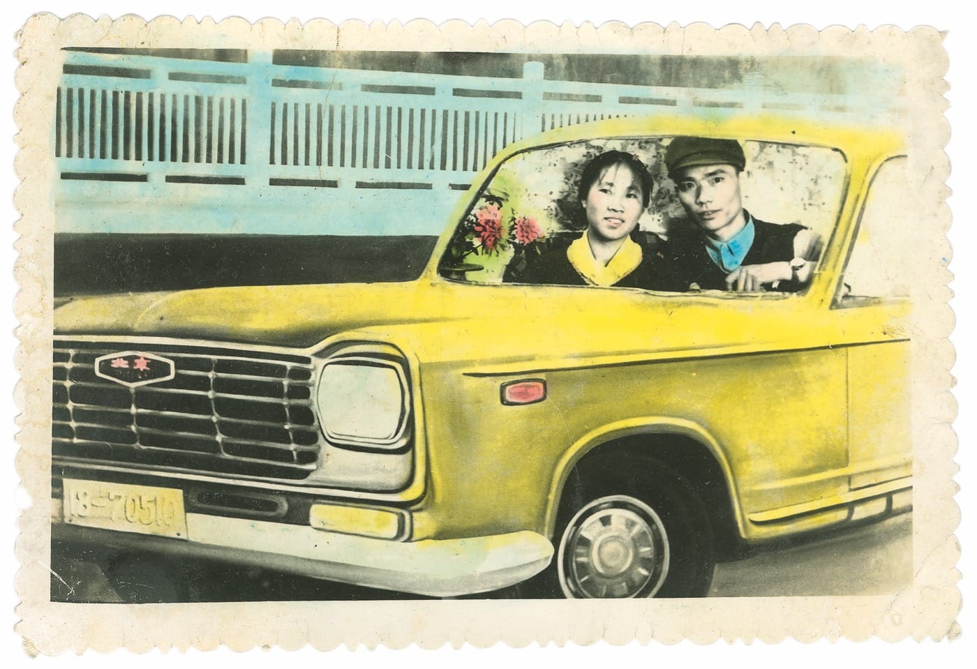 The desire for these vehicles representing freedom, wealth, and sexual potency seeped rapidly into other parts of the world. In French Sudan, which would gain independence and become Mali in 1960, Seydou Keïta captured families in their best dress standing in front of their cars, flecked just slightly by the dirt from the gravel roads. Professional shots from a studio in 1950s China, when vehicle production was just beginning there, show that the lack of passenger cars on the road did not hamper people’s eagerness to be photographed in one, even if the vehicle was fake. Arranged behind cardboard cutouts of cars, they look crammed and unnatural, their arms resting stiffly on makeshift steering wheels. The incongruity is heightened by the colors liberally applied by hand, creating in one instance a blue car with pink wheels and a green windshield, thus underscoring the fantasy associated with cars.