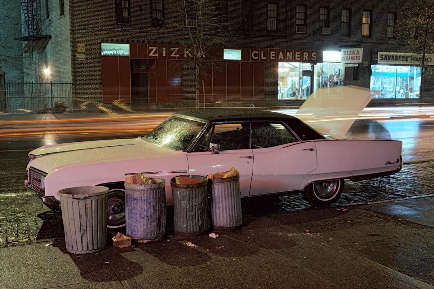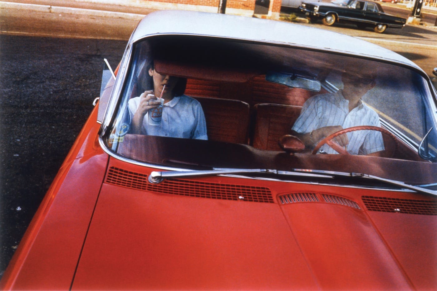 By eliminating the energy and movement of human bodies, photographers were able to draw out the beauty of these automobiles. Yasuhiro Ishimoto captured the calming sight of soft, untouched snow settling on parked cars in the Chicago winter. Ray Metzker’s high-contrast photos highlight the geometry formed by cars within their urban surroundings, like in “Philadelphia” (1964), which plays up a trio of white lines formed by the gleam of an open car door, the light emanating from street lamps, and the lane divider on the pavement. Lee Friedlander, using the interior of his rental car to frame his America by Car series (1995-2009), tapped into the smooth curves of the dashboard and windshield, as well as the play of reflection in the side-view mirror.