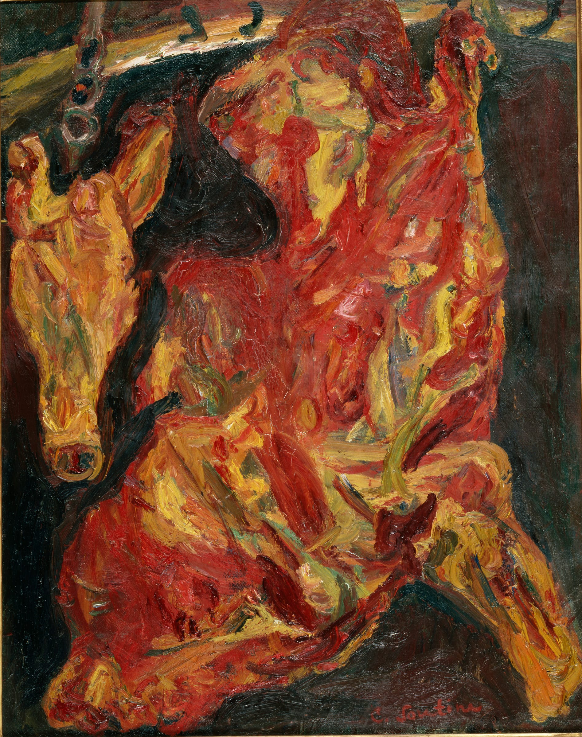 Oblivious to both the smell and the army of flies that began to plague the decaying flesh, the artist raced between canvas and carcass, brushing fresh blood on the beef as he sought to capture its details in paint. During all this frenetic activity, his assistant Paulette Jourdain fanned the flies away from the hulking mass of putrid flesh. In this excited, nearly ecstatic, state of the creative process, Soutine was caught between the reality of the transient object and the creation of its image on canvas.
