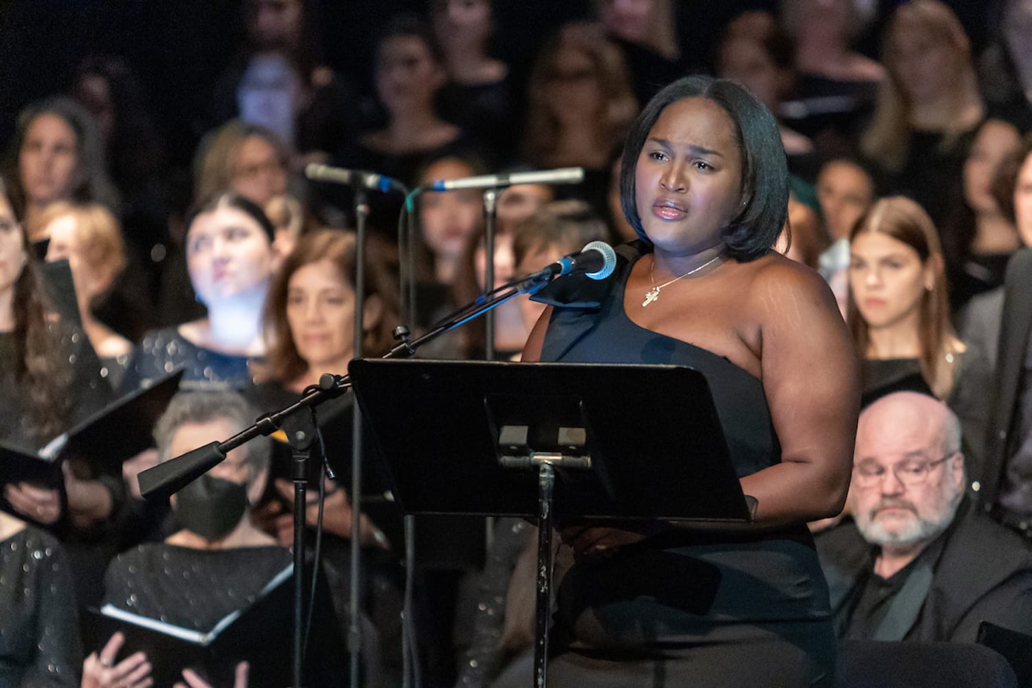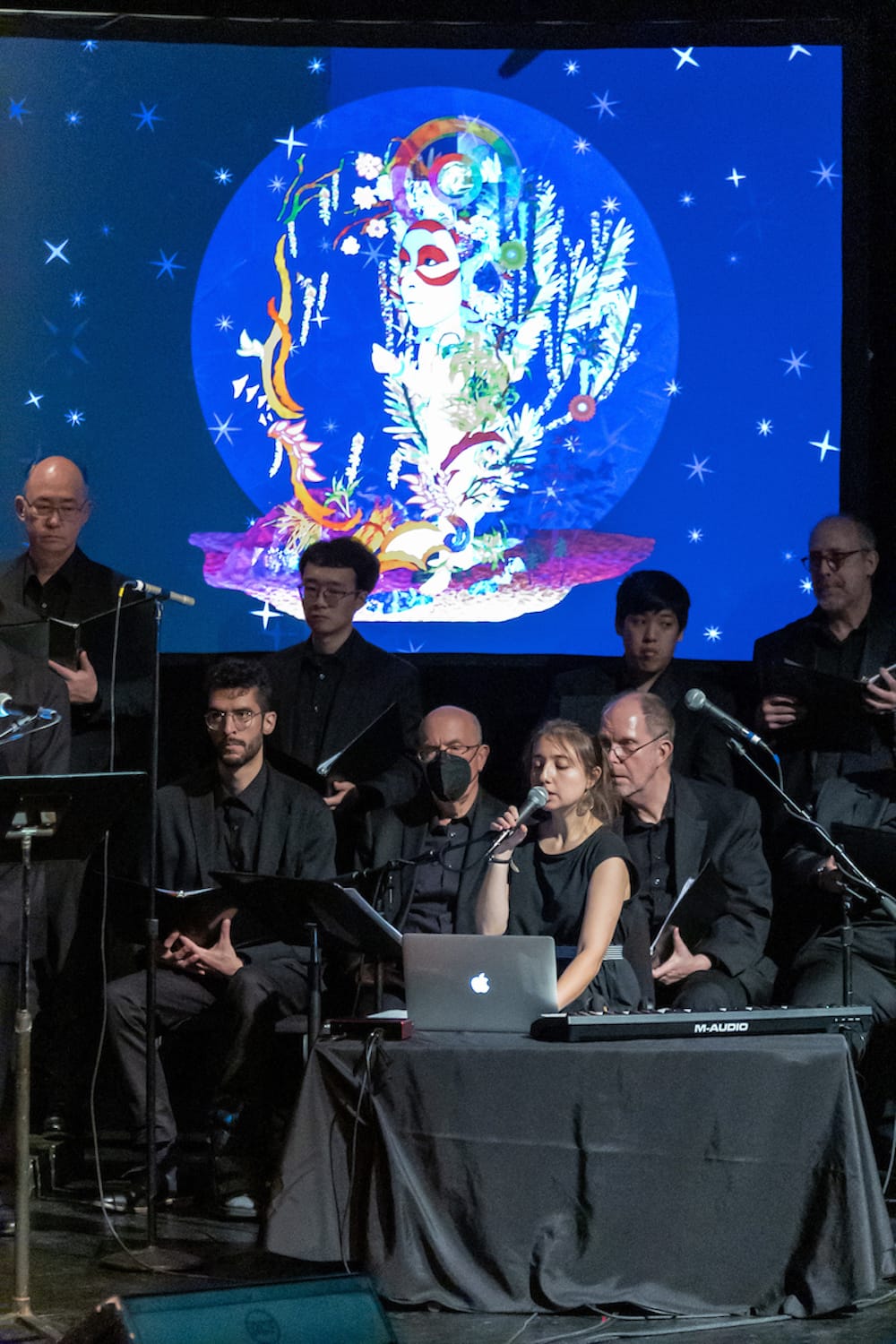 Once the overhead lights darkened, a lone figure — musician Raquel Acevedo Klein — strode across the stage. She sat down in front of a spread of tools (silver Mac laptop, microphone, M-Audio MIDI keyboard controller) and set to work. Vibrating electronic music wisped through the room, joined by Acevedo Klein’s spare, ethereal vocals. Around 150 choir members, clad in black clothes with a smattering of onyx-colored sequins, poured into nearly every available space onstage, along with conductor David Haynes, his back to the crowd. The electronica merged with Bergamot Quartet’s violins, viola, and cello, eventually giving way to soprano Chantal Freeman’s golden, ascendant voice and the choir’s rich layers of glowing tones. Mesmerizing, almost psychedelic imagery by visual artist Saya Woolfalk morphed across the screens, forming a dreamy landscape of stars, mystical symbols, plant forms, and avian figures.