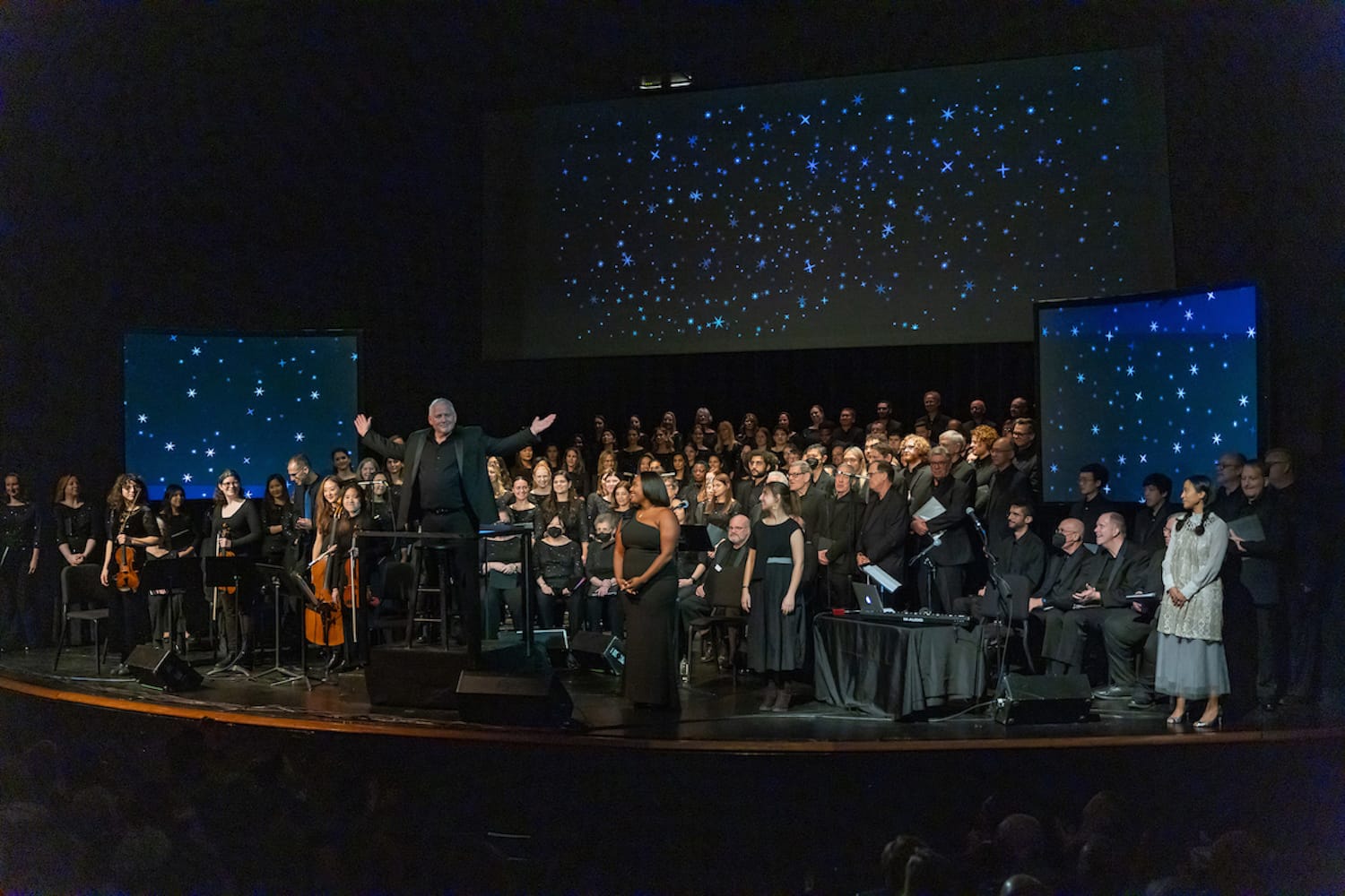 A starscape twinkled across three screens as guests filed into the Gerald W. Lynch Theater for the multimedia performance Angel of Many Signs. Presented by the New York Choral Society, this two-show run featured the New York premiere of composer Kevin Siegfried’s Angel of Light, a cantata inspired by Shaker melodies and texts.