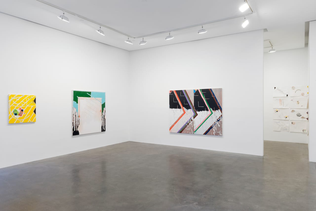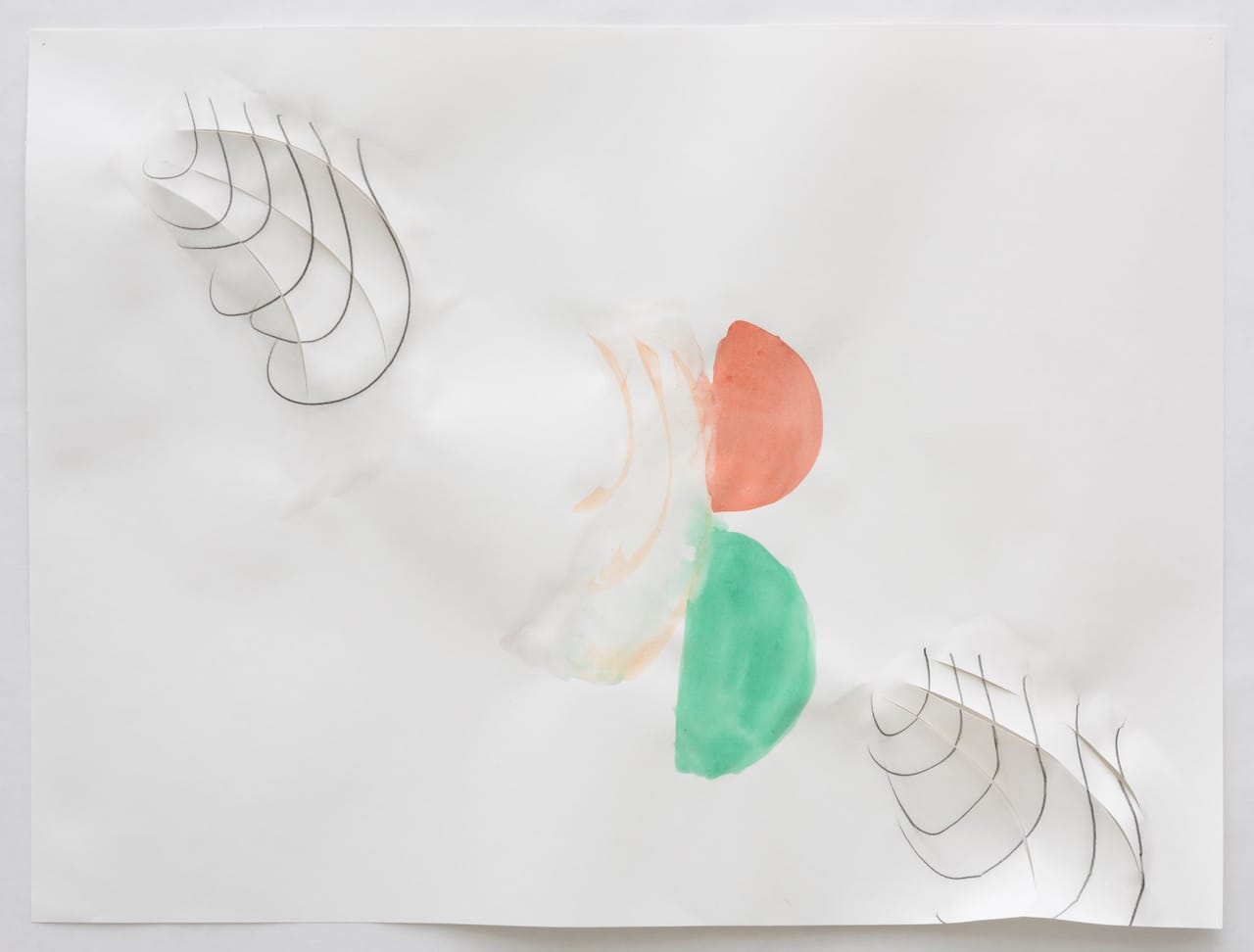 The paintings are complimented by two sets of sixteen individually numbered drawings titled “Doubles” (all 2015). Each set is installed on adjacent walls, eight to a side. In the drawings, Miller often cuts and peels back a similar pair of geometric shapes, drawing and painting on the obverse side. This doubling makes the gesture of cutting less precious, more part of a system, though what that scheme might be is never clear. It seems to me that Miller’s drawings are a way to accumulate a vocabulary of abstract shapes and marks.