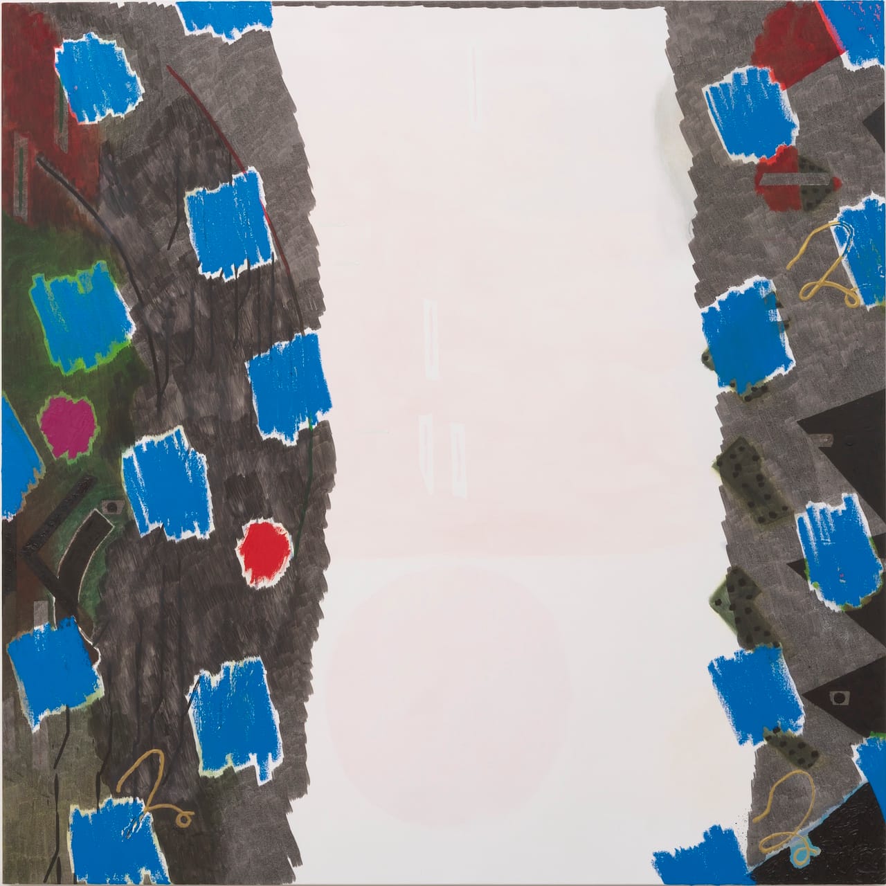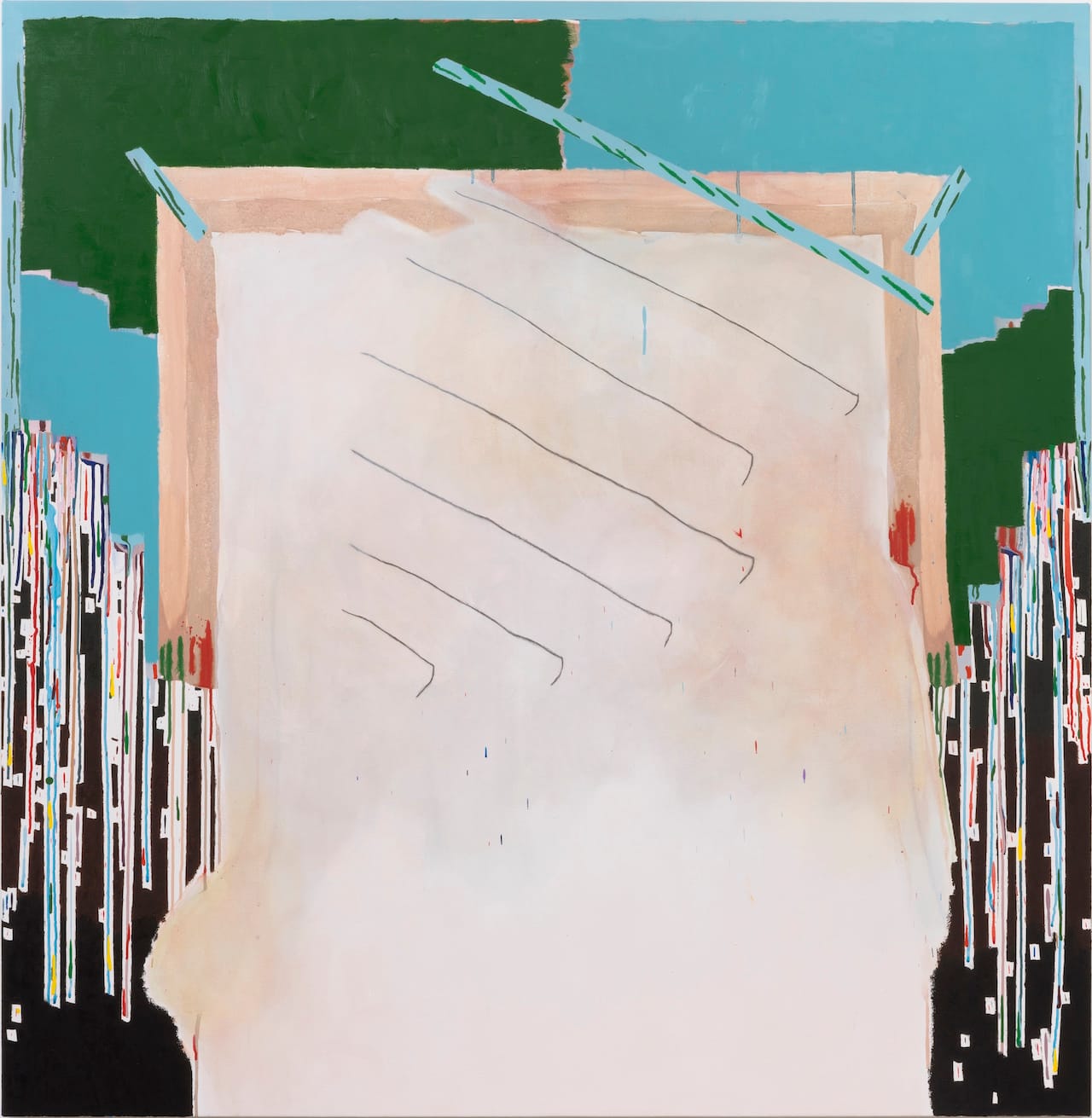 In the nearly square painting “Flush Arch” (2015), Miller uses oil paint, oil stick, acrylic, and pencil to evoke a piece of raw canvas affixed to a studio wall. I only came to this reading of the painting after I focused on the three turquoise bands, which extend from the painting’s ground to the seemingly “raw canvas.” The vertical bands on either side of the “raw canvas” evoked the bare areas left after strips of masking tape covered with paint have been pulled up. Miller makes a series of colored lines in these bare bands, which confounds our ability to place them: are they in front, behind or beside the plane of surrounding them? Elsewhere, Miller uses masking tape to puncture a layer of paint she has put down, which is different than how it has historically been used in hard-edge abstraction.