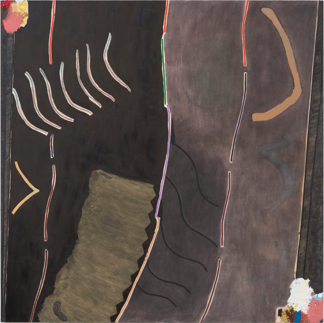 Miller’s process isn’t to cover the canvas with paint so much as to cover and uncover it, to interrupt, upend or subvert an expectation. For her, a canvas isn’t a surface to which another uniform surface is applied, but a kind of diary where things are added, covered over, uncovered — a combination of construction and archaeology. To assemble her paintings, she has transformed aspects of trompe l’oeil, hard-edged abstraction (the use of masking tape), patterning and repetition, transparency and layering, as ways of assembling her paintings. She also seems to have gotten something from the French affichiste artist Jacques Villeglé’s use of torn posters in his decollage. All these possible sources are subsumed into the painting; there is no citation, irony, or nostalgia, only the present tense of the painting, with the whitish rectangle framed on the top edge and part of both sides by two tawny bands of color.