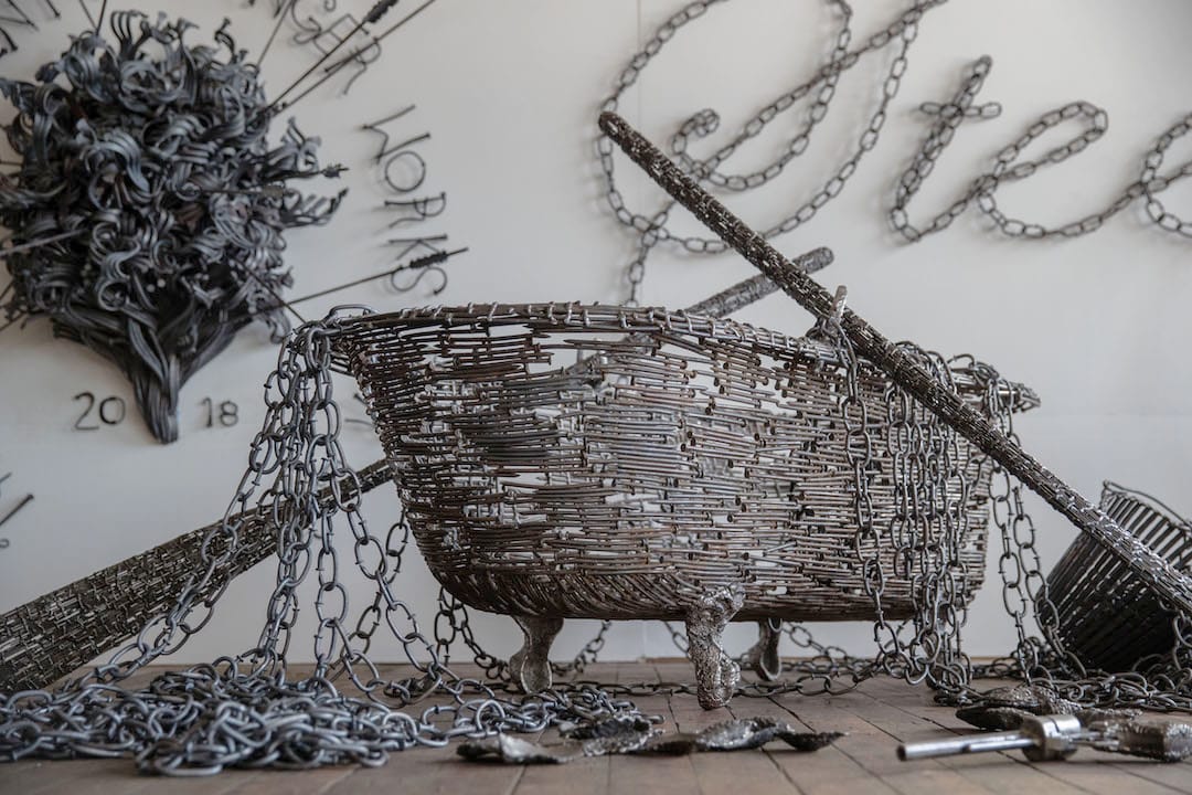Sculptor John Bisbee is celebrated for his masterful work created exclusively from forged and welded nails, transforming their simple form into sculptures that defy the imagination. From tiny nails to 12-inch spikes, Bisbee has been welding, hammering, and bending nails for the past 30 years. John Bisbee: American Steel is a statement about the current political and cultural state of America. Set against the backdrop of declining American manufacturing, factory outsourcing, and the mechanization of labor, American Steel is a metaphor for larger conversations about economics, culture, and America’s uncertain place in the world.
