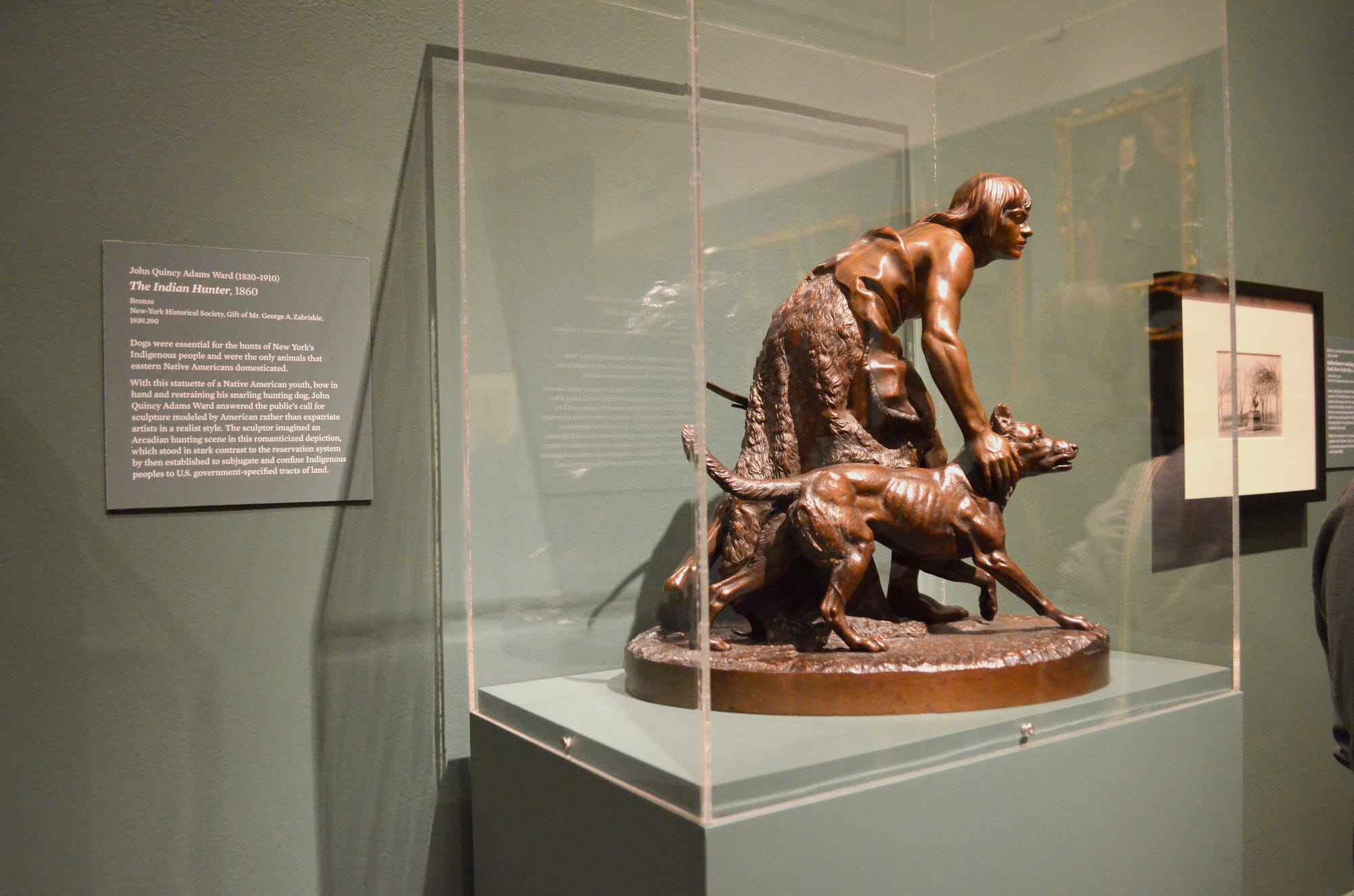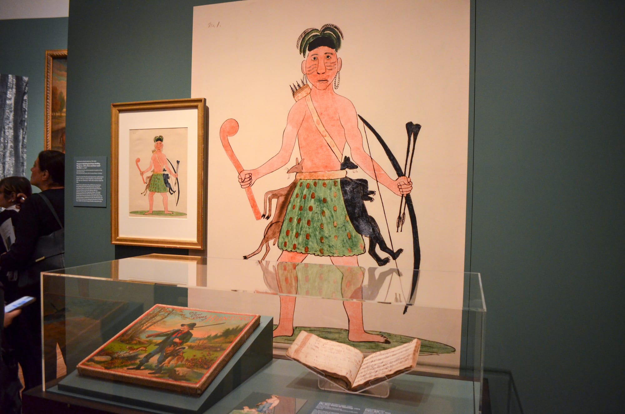 The exhibition begins in a small gallery space featuring works documenting interactions between animals and Indigenous people in the region. A large drawing by the Tuscarora artist David Cusick imagines a mythological Iroquois hunter with a deer and bear under his belt. On one end, a bronze sculpture by John Quincy Adams Ward generically titled “The Indian Hunter” (1860) is described on wall text as promoting a “romanticized depiction” of a young man and a domesticated dog. Across the room, encased in a glass box, a land deed from 1729 contains the signature of an unidentified woman, represented by a turtle icon.