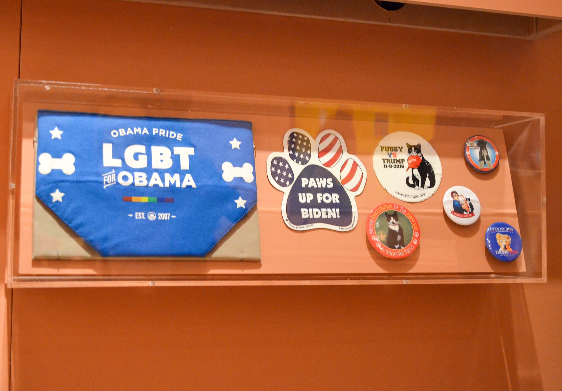 A display of political merchandise invoking pets in elections — including a bandana that tries to amalgamate every progressive issue into a dog-sized collar reading “Obama Pride, LGBT FOR OBAMA" with a pride flag and dog bones — interrogates the use of pets in political campaigns.