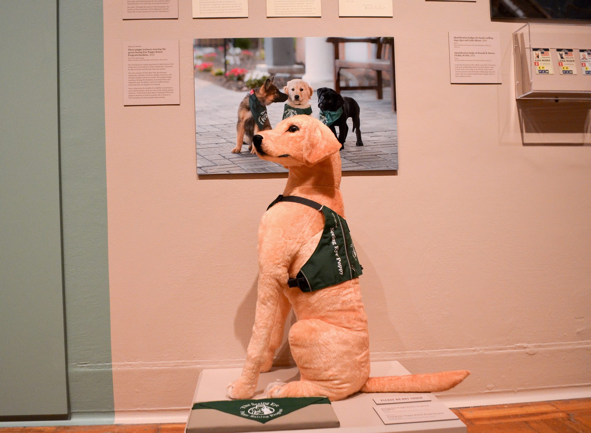 In a section entitled Pets at Work, World War I messenger pigeon Cher Ami gets his moment. A message carried 25 miles by the bird to the 77th Infantry Division of New York, which fought in France, sits in a glass case. Nearby, a plush Golden Retriever and portraits of puppies commemorate the organization Seeing Eye, which trains guide dogs for blind individuals.