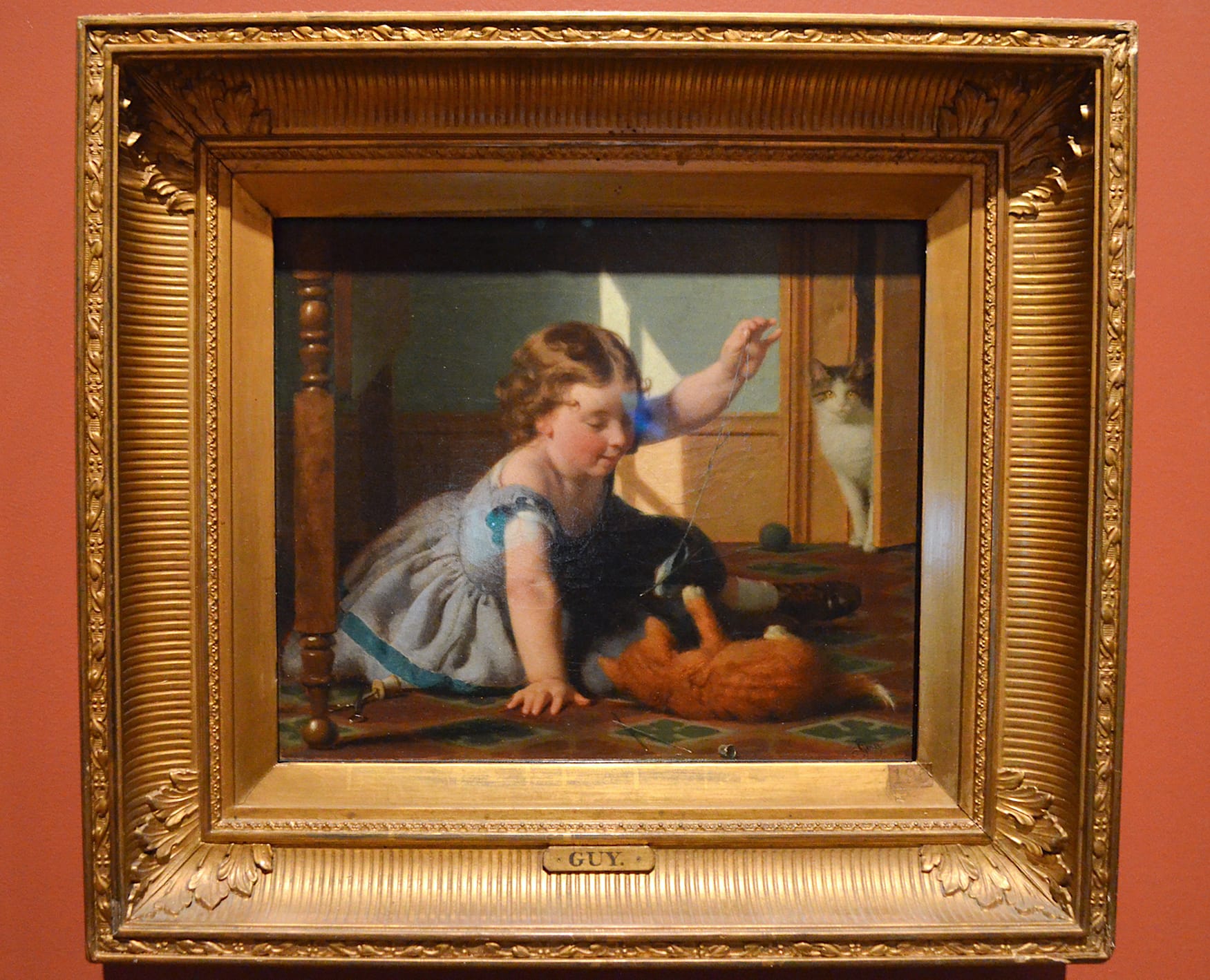 Visitors will then encounter 18th-century portraiture of the children and pets of New York’s early settlers in the Dutch and English visual traditions. In these early works, children are portrayed with lambs and deer, which symbolized harmony and peace to emphasize the subjects’ moral righteousness, according to Olson. Further along in the gallery, Victorian portraits present more conventional renderings of children and kittens.
