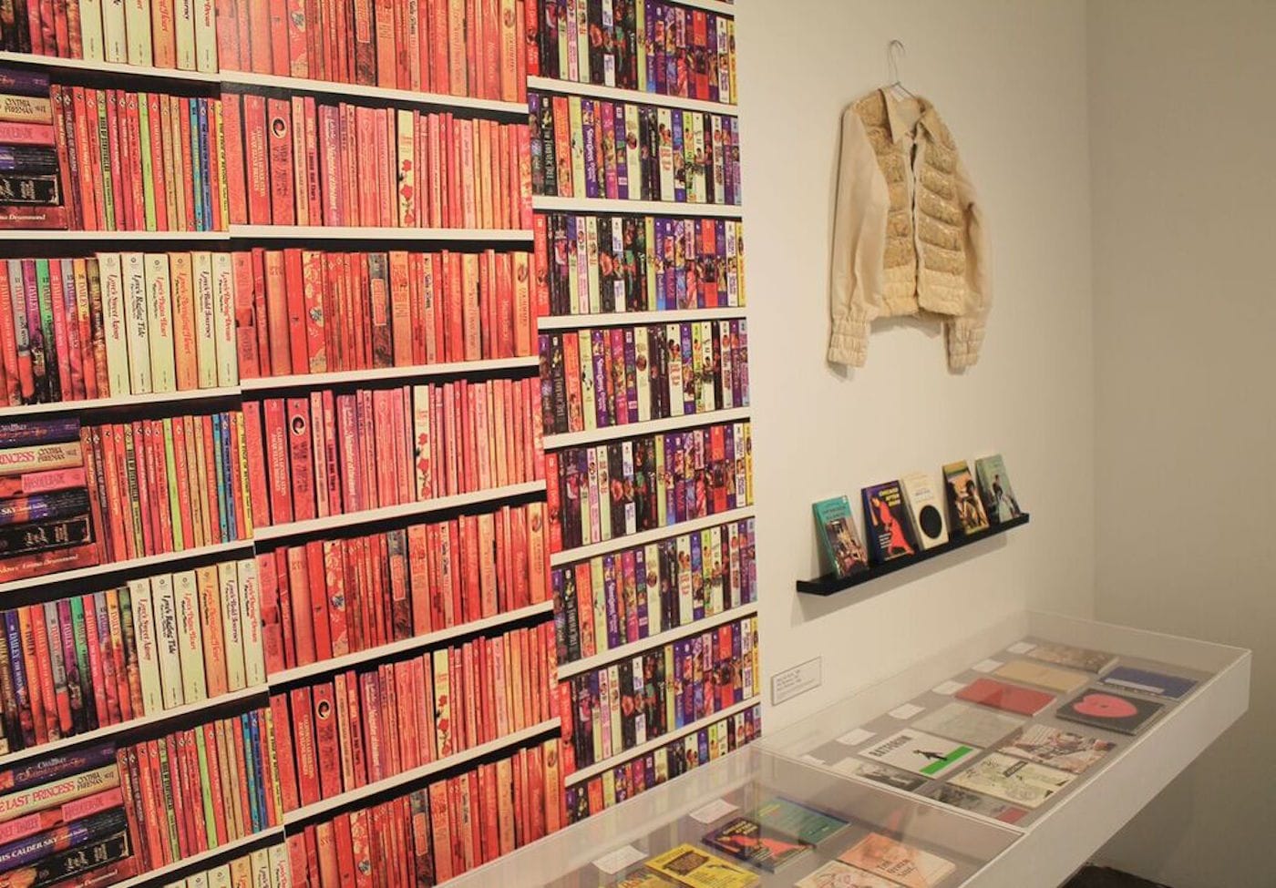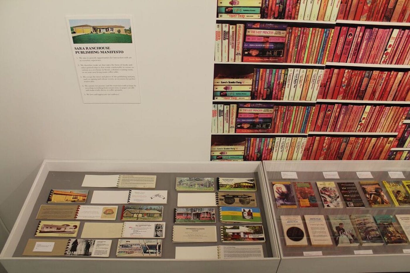 Romance factors heavily into another of Alatalo’s publishing projects, the Sara Ranchouse Pulp Series, which appropriates the language and format of genre fiction, particularly that of romance novels. These books, which Alatalo both wrote herself and published by others, unite diverse pulp fragments of text and imagery, playing with the universal template underlying the genre. The collage stories, despite the shifting character names and differing specific details from page to page, are remarkably legible as a new narrative. What’s useful about the show is that, since Printed Matter is both an exhibition space and bookstore, the titles in the exhibit are displayed in a glass vitrine as well as available for sale on a store table, where the viewer can browse, handle, and read them at leisure. Especially since they are published as cheap paperbacks, this seems especially necessary for understanding Alatalo’s publishing vision, to which placing her artworks in homes was central.