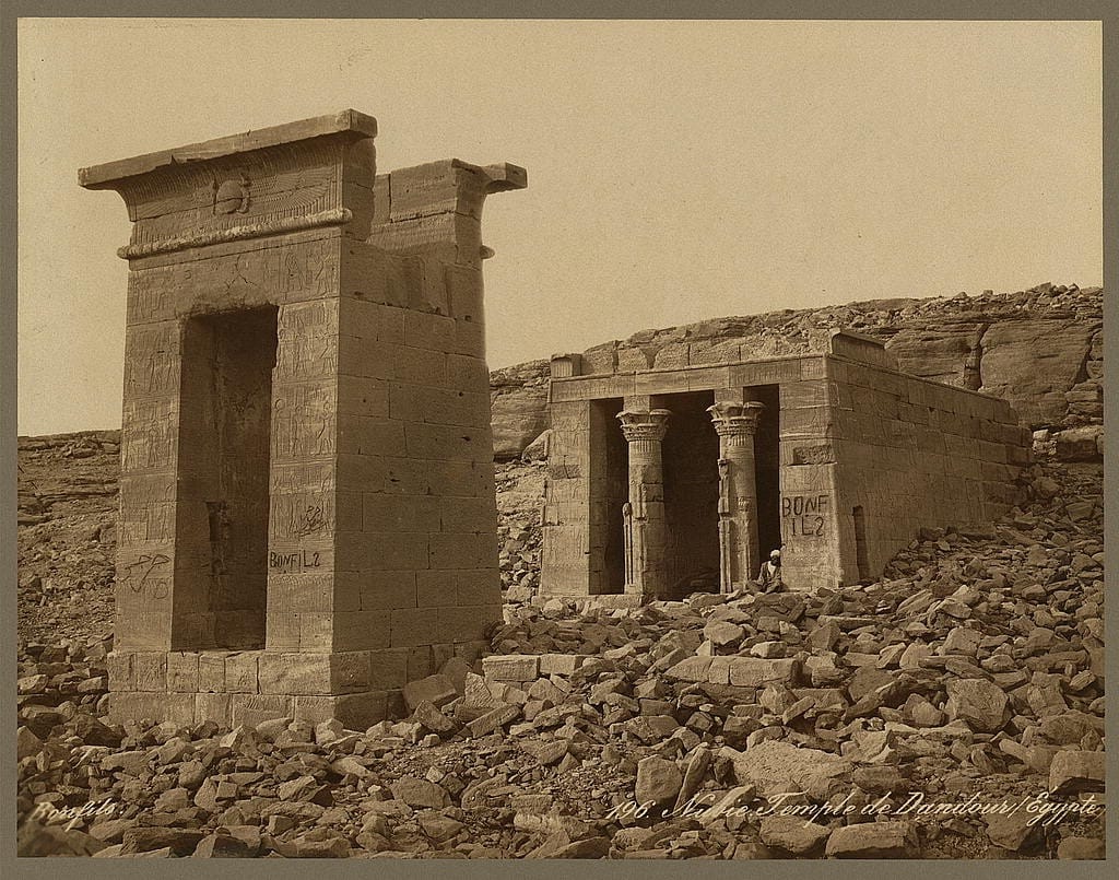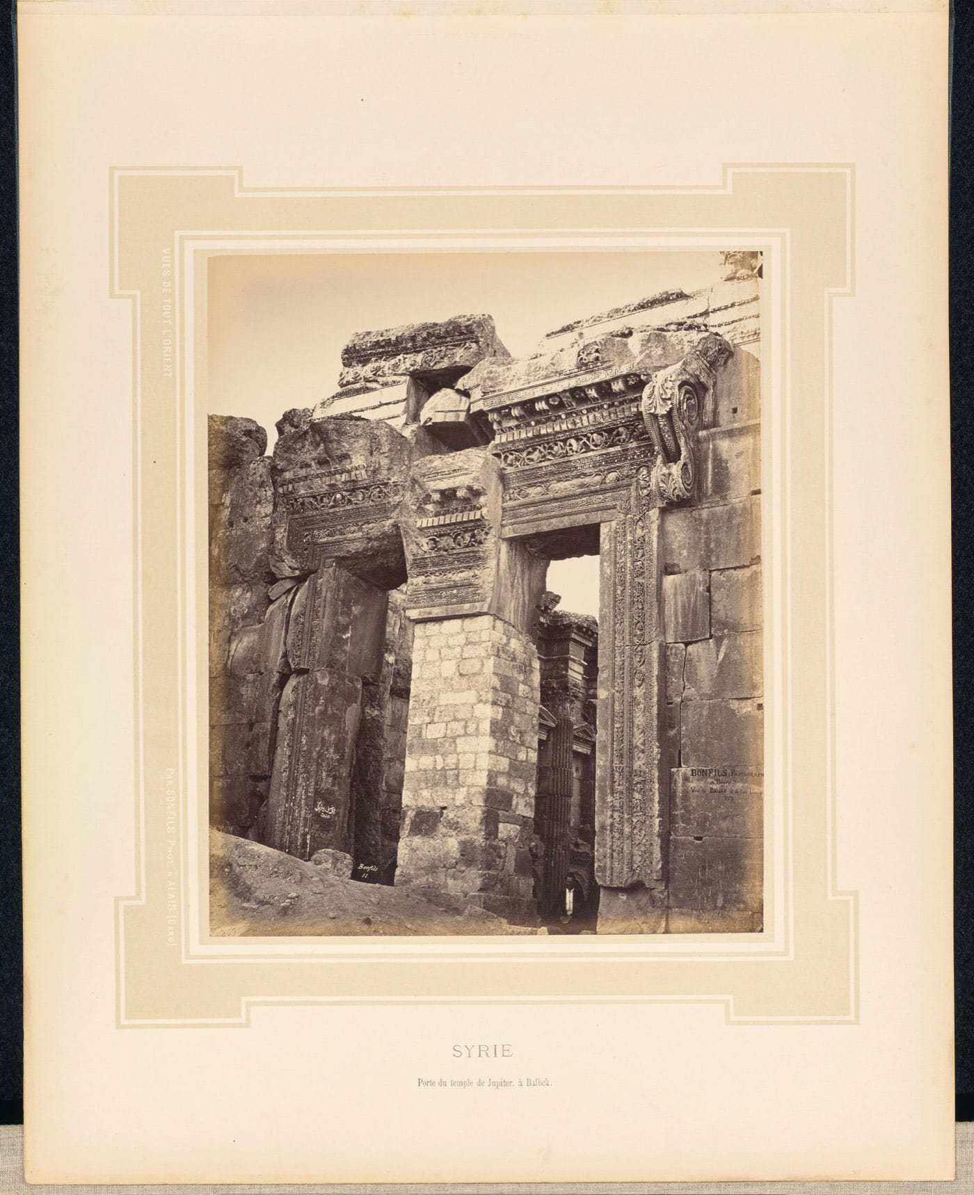 For the 19th-century photographer Félix Bonfils and his studio, graffiti could serve a commercial purpose, as in his advertisement placed on the gate of the ancient Temple of Bacchus at Baalbek. But gradually the Bonfils ad was covered by graffiti from visitors — in this case local visitors — left in both Arabic and Latin script in emulation of European travelers. At the Temple of Dendur, amid the many inscribed names of European travelers, a Bonfils photograph shows the studio name painted on the temple walls. But also visible is the brief text “Girgis, photographer,” perhaps referring to the pioneering Beirut-based photographer Georges Sabounji. Bonfils’s local assistants were generally anonymous, but here at least one has left his mark for posterity.