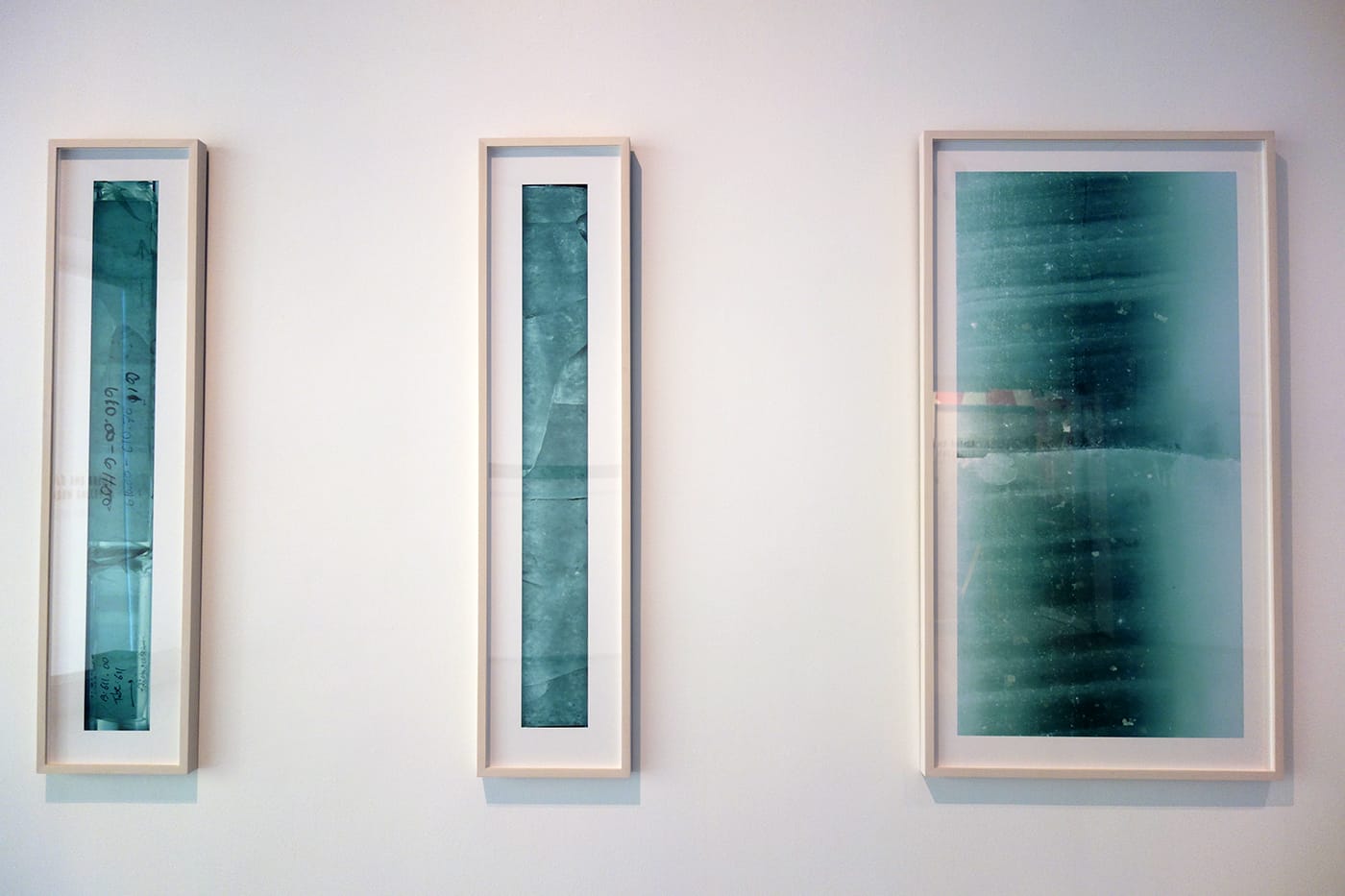 Ice cores act as paleothermometers, or tools for understanding the temperatures of the past. For instance, ash from 18th-century volcanic eruptions can be detected in the compressed layers of ice, as well as more recent concentrations of carbon dioxide. “88 Cores” is accompanied by a droning score by Celia Hollander, which slows down over the course of the video, reinforcing the monumental timeline represented by this ice. Alongside, the photographs highlight details like cracks from excavation, banding from dust and debris, and scientific notations, reminding viewers of the vulnerability of this polar ice, and the importance of studying its fragile data.